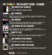 Mit The Atlantic Years In Mono gedenkt Atlantic Records dieses außergewöhnlichen Mannes und Musikers, der im September 86 Jahre alt geworden wäre, nun mit einer umfangreichen 7 LP-Box, welche die Atlantic-Alben The Great Ray Charles, Ray Charles, Yes Indeed!, The Genius Of Ray Charles, What I'd Say, The Genius After Hours und The Genius Sings The Blues enthält.