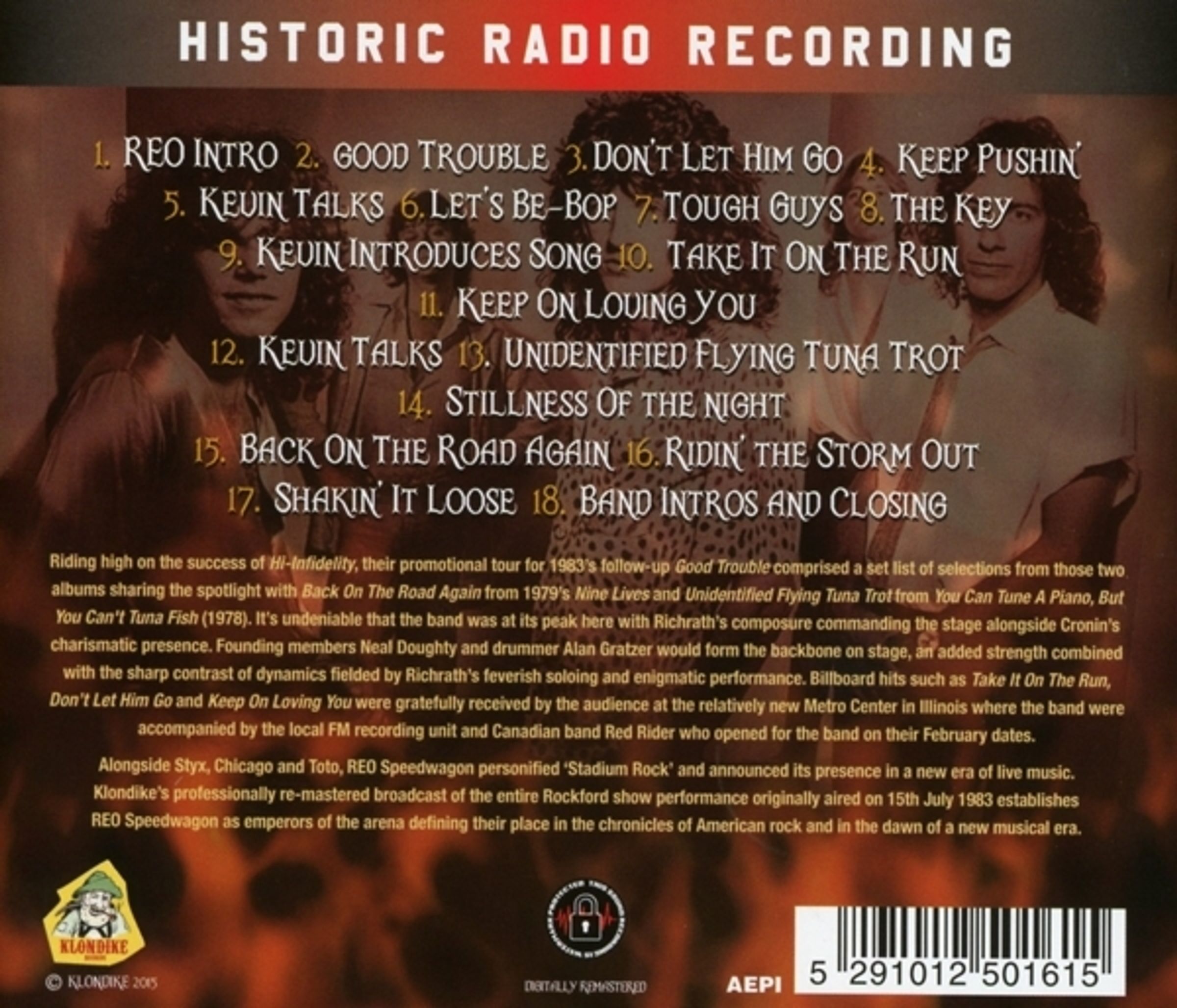 Wenn eine US-Band zu den Vertretern des AOR (Adult Oriented Rock) gezählt werden muss, dann sind es REO Speedwagon, die mit dem 1982er Erfolgsalbum ‘Good Trouble‘ eine noch kommerziellere Richtung vorgaben, ohne die Rock’n’Roll-Wurzeln zu verleugnen. Einfach war es nicht, nach dem Millionen-Seller »High In Fidelity« einen passenden Nachfolger zu finden. Trotz Writer-Blockade bei Sänger Kevin Cronin kamen aber Hits wie »Keep The Fire Burnin’«, »I’ll Follow You«, »Stillness Of The Night« oder der Titeltrack heraus und REO Speedwagon konnten vor allem in den USA nochmals ihren Status als mit wichtigster Vertreter des Radio-Rocks zementieren. 1983 wurde dann auf einer Promo-Tour dieses Radio-Konzert mitgeschnitten, das nun in exzellenter Qualität verfügbar ist. Im Mittelpunkt stehen dabei aber vor allem Songs aus den späten 1970er Jahren und natürlich von »Hi-Infidelity« mit seinem Überhit »Take It On The Run«…