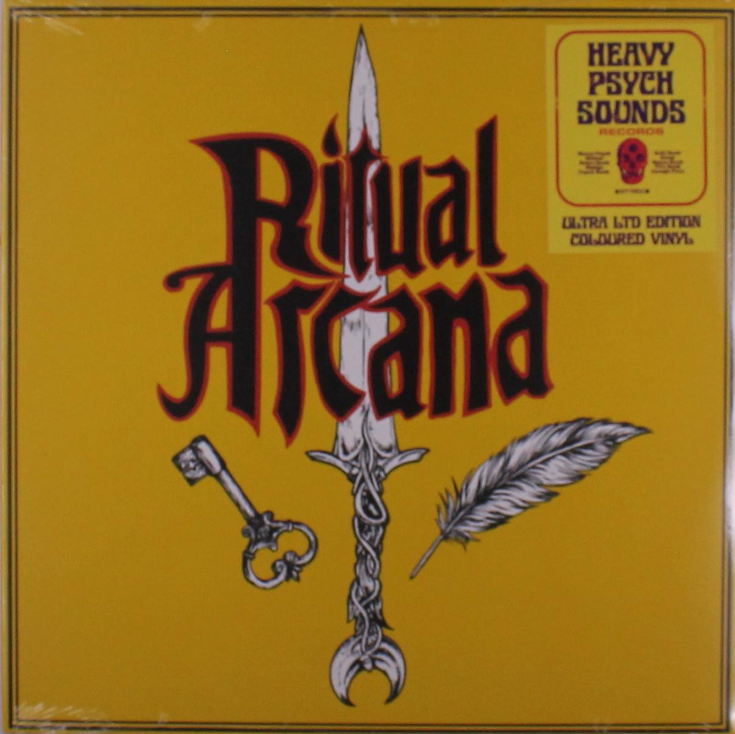 "Ritual Arcana" in gotischer Schrift, daneben ein Schlüssel, ein Dolch und eine Feder auf gelbem Hintergrund., LP