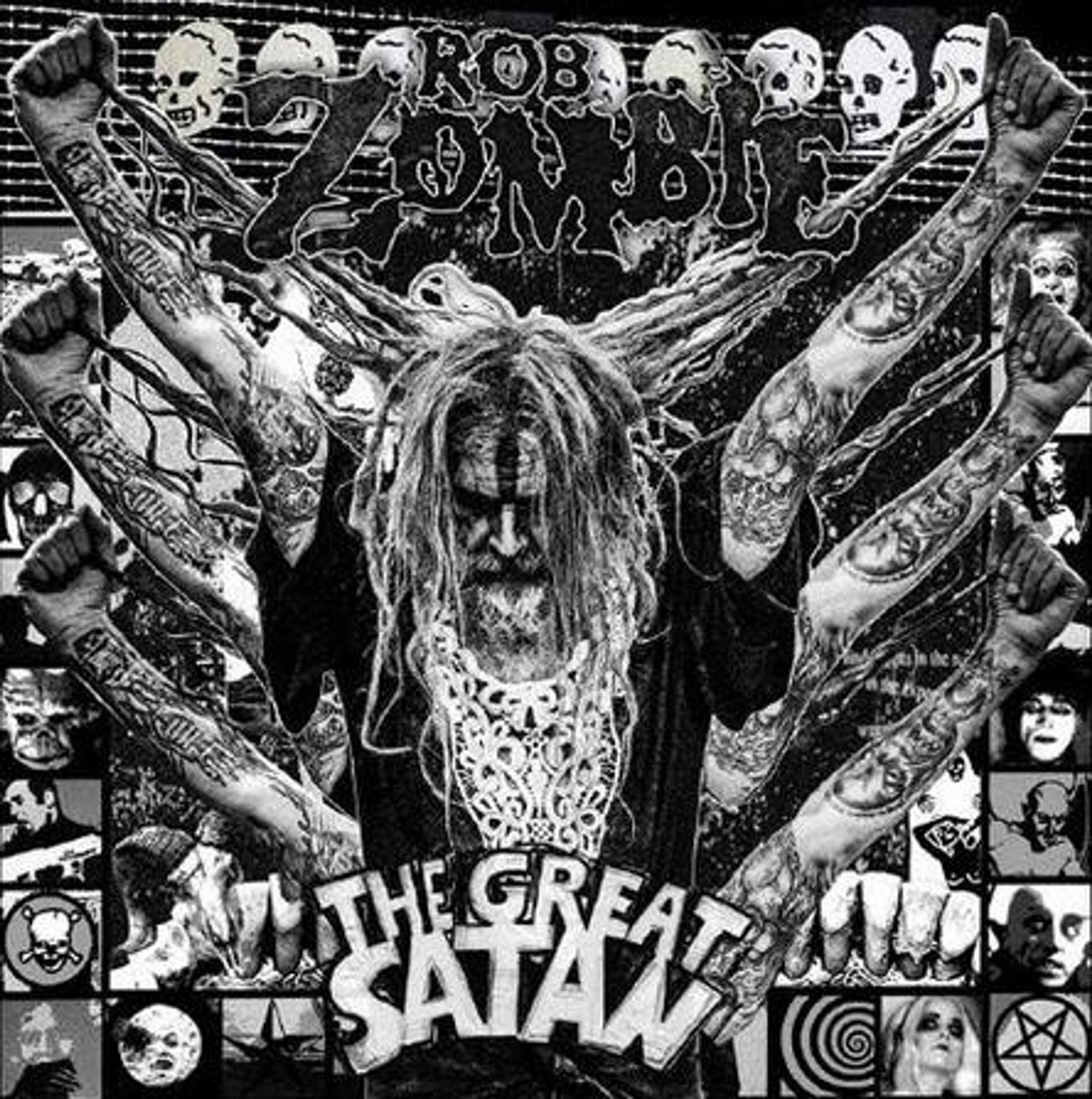„ROB ZOMBIE“; „THE GREAT SATAN“. Schwarz-weißes Design mit düsterem Thema, zentral stehendem Mann, mehrfachen Armen., CD
