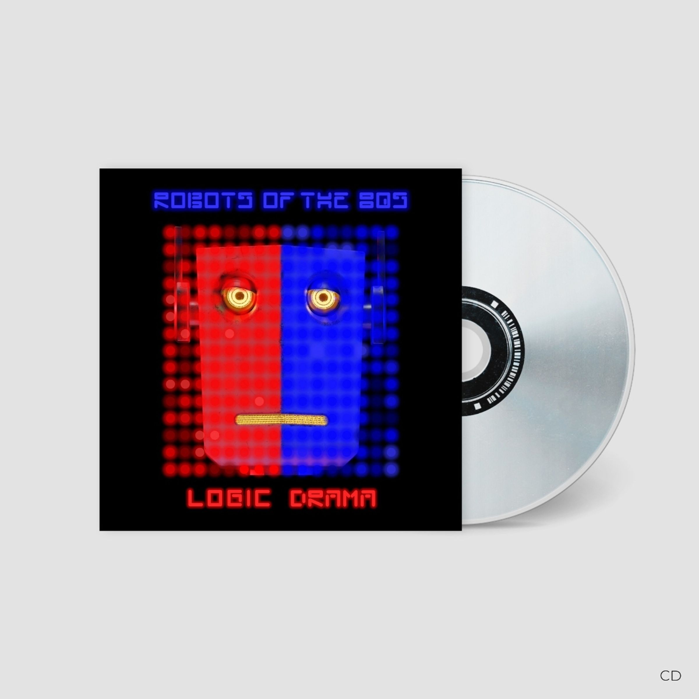 "ROBOTS OF THE 80s", "LOGIC DRAMA". Illustration eines Gesichts, links rot, rechts blau, aus leuchtenden Punkten., CD