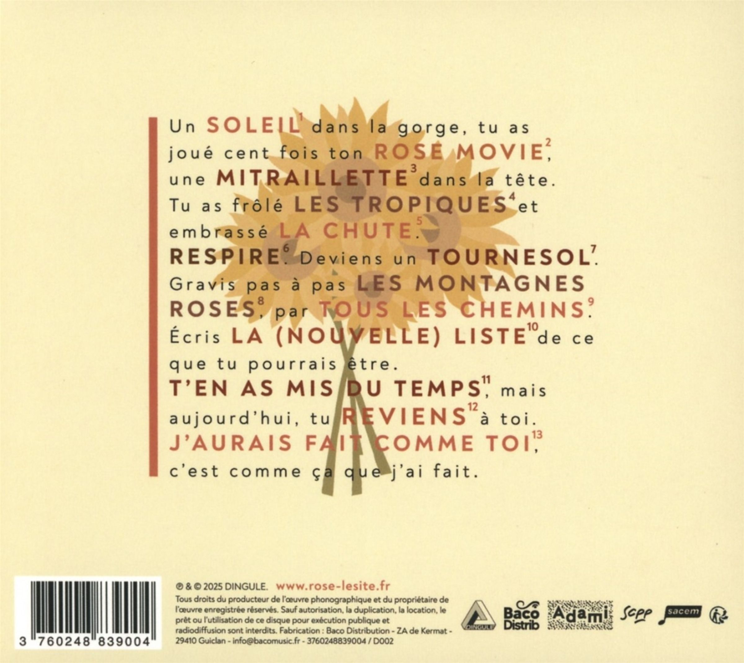 Rose traf mit ihrem selbstbetitelten Debütalbum 2006 und insbesondere dem Song »La Liste« den Nerv einer ganzen Generation - fast 100 Wochen hielt sich das Album in den Charts und erreichte Doppel-Platin. In den folgenden 15 Jahren veröffentlichte Rose vier weitere Alben, schrieb auch für Kolleg*innen wie Patricia Kaas, Jenifer Amel Bent, Louis Bertignac, Tina Arena oder Julie Zenatti und ist seit 2022 mit ihrem Podcast »Contre-Addictions« erfolgreich. Die 13 Novuelle-Chanson-Songs auf »Rose Movie« werden von einem gleichnamigen Buch und Liveauftritten begleitet.