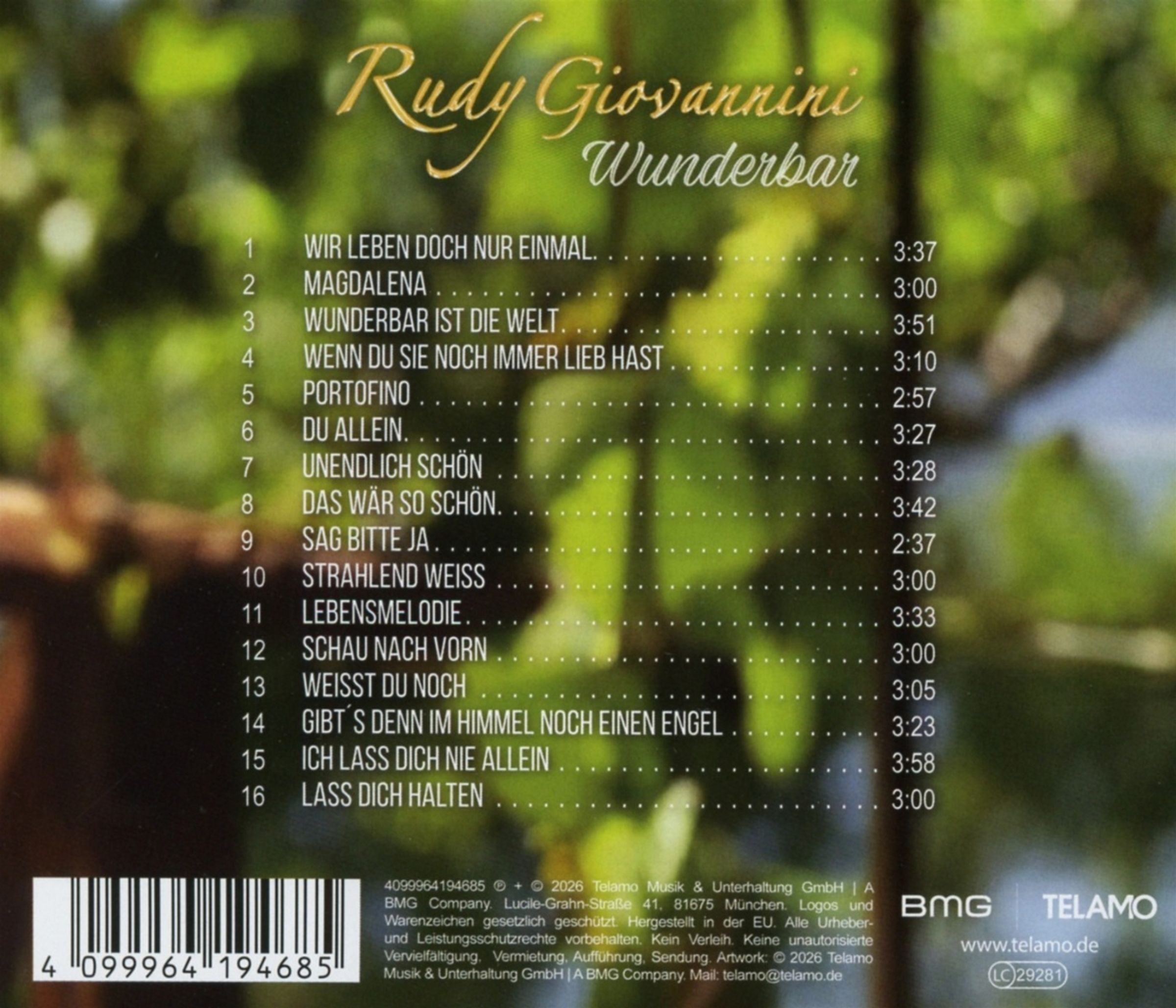 Der kommende Frühling wird »Wunderbar« - mit dem neuen Studioalbum von Rudy Giovannini, dem unverwechselbaren »Caruso der Berge«! Nach seinen jüngsten Top-5-Erfolgen in Deutschland und Österreich präsentiert der Südtiroler Ausnahmesänger 16 neue Lieder voller Gefühl, Lebensfreude und musikalischer Eleganz.