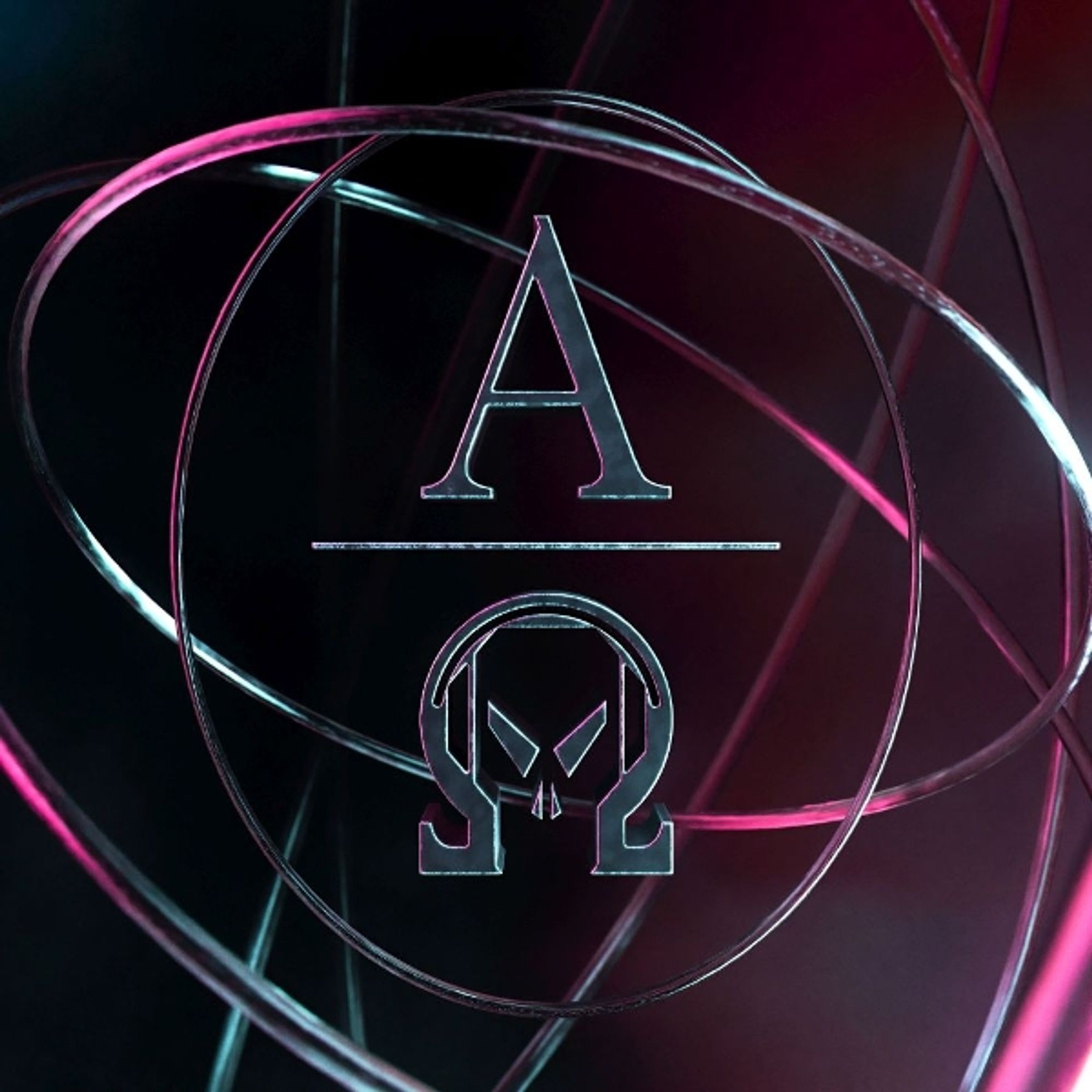 Der Buchstabe "A" über einer Linie, darunter ein Ω (Omega) mit stilisierter Maske. Umgeben von ineinander verschlungenen Ringen., LP
