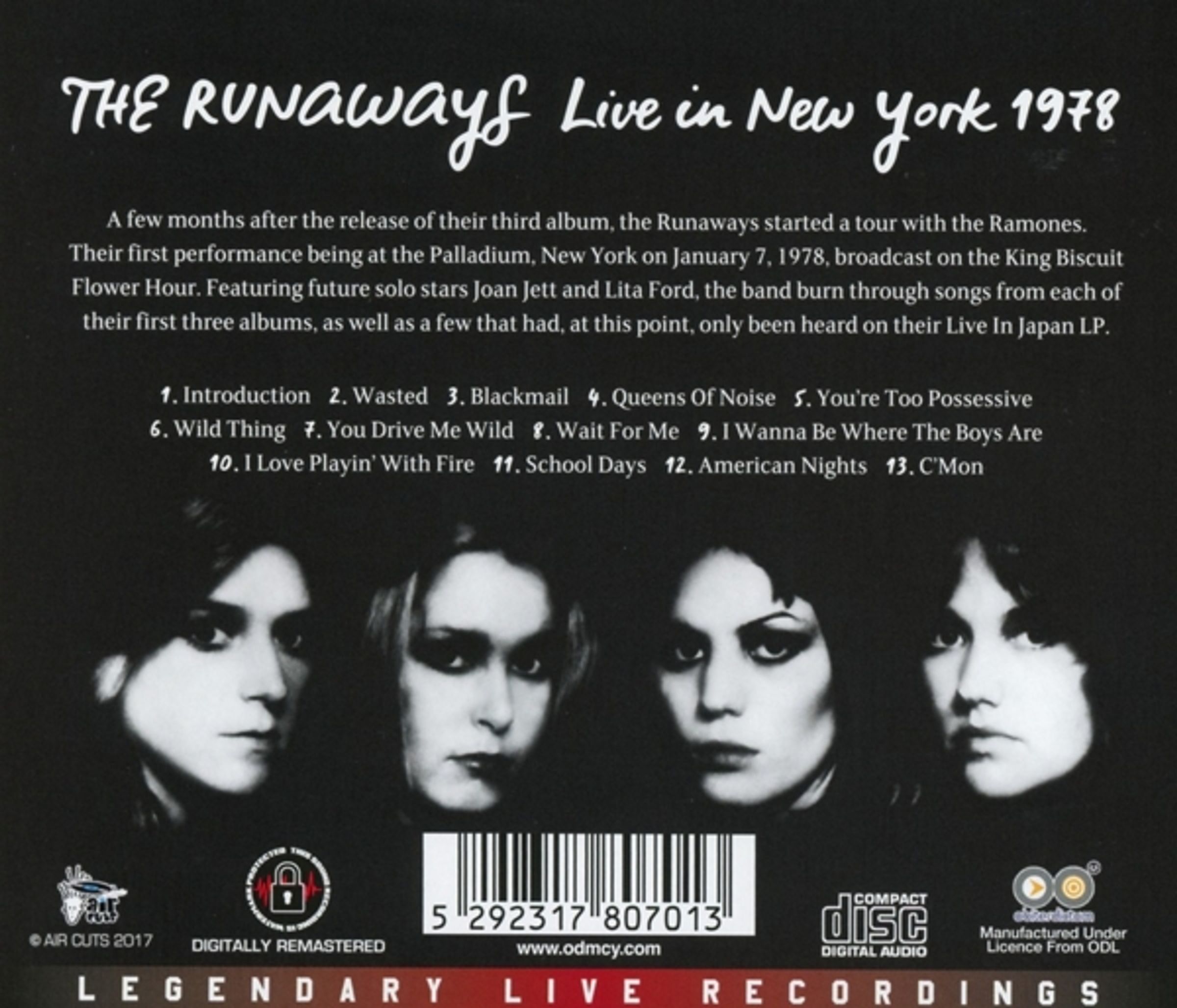 A few months after the release of their third album, the Runaways started a tour with the Ramones. Their first performance being at the Palladium, New York on January 7, 1978, broadcast on the King Biscuit Flower Hour. Featuring future solo stars Joan Jett and Lita Ford, the band burn through songs from each of their first three albums, as well as a few that had, at this point, only been heard on their »Live In Japan« LP.