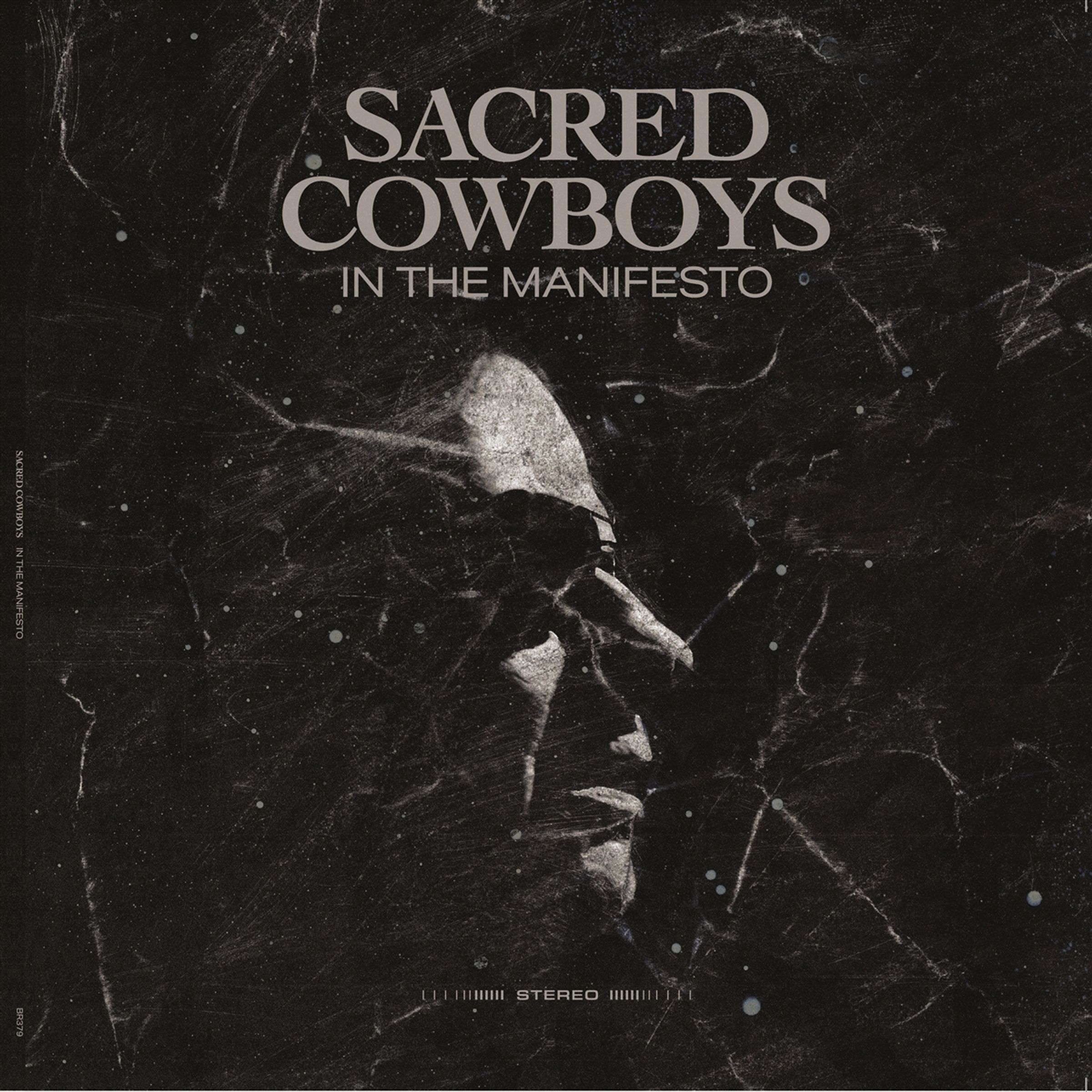 "SACRED COWBOYS IN THE MANIFESTO" steht in großen Buchstaben über einer dunklen, mysteriösen Illustrationsfläche., LP