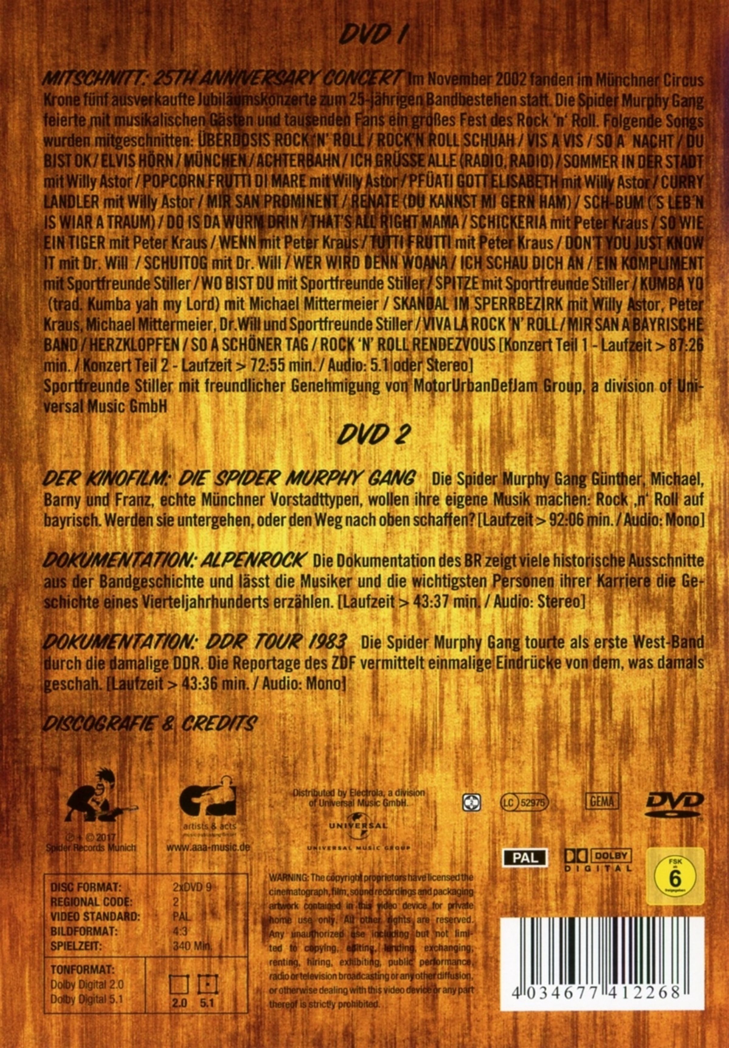 Mehr als 348 Minuten gefüllt durch das Spider Murphy Gang 25th Anniversary concert mit Special Guests wie Michael Mittermeier, Peter Krauss, Willy Astor, Dr. Will und Sportfreund Stiller..., dem kompletten Spider Murphy Gang Kinokultfilm aus den 80ern inkl. der Dokumentation Alpenrock und DDR Tour 1983.