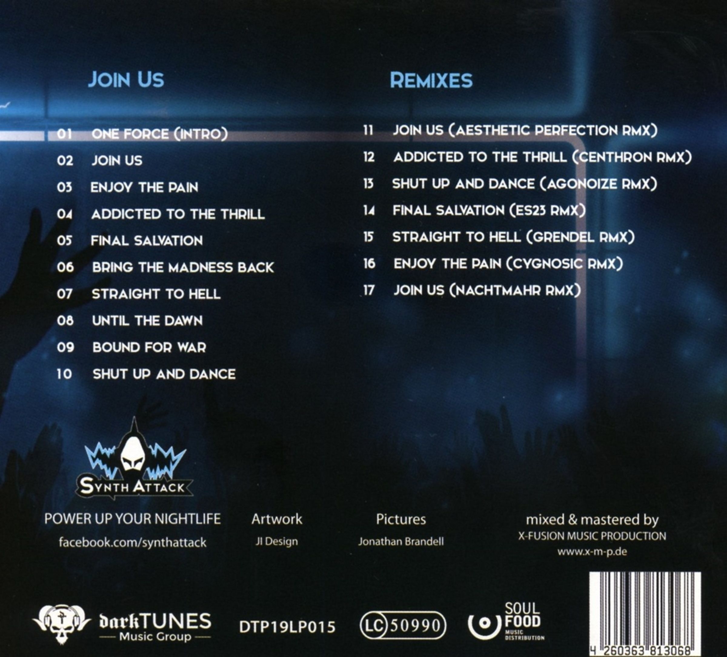 Mit dem neuen Album der Harsh Electro Kombo überschreiten SYNTHATTACK ein ums andere Mal feste Genregrenzen und heizen die Verschmelzung von Elementen aus dem Industrial und Electro an. »Join Us« ist ein explosiver Cocktail aus eingängigen Break-Downs, harten Beats und hypnotischen Melodien, welche die Zuhörer in wenigen Minuten auf die Tanzfläche ziehen. Die Band jagt ihr Publikum mit stampfenden Hymnen durch ein Wechselbad der Gefühle und wartet mit überraschenden Wendungen im richtigen Moment auf.