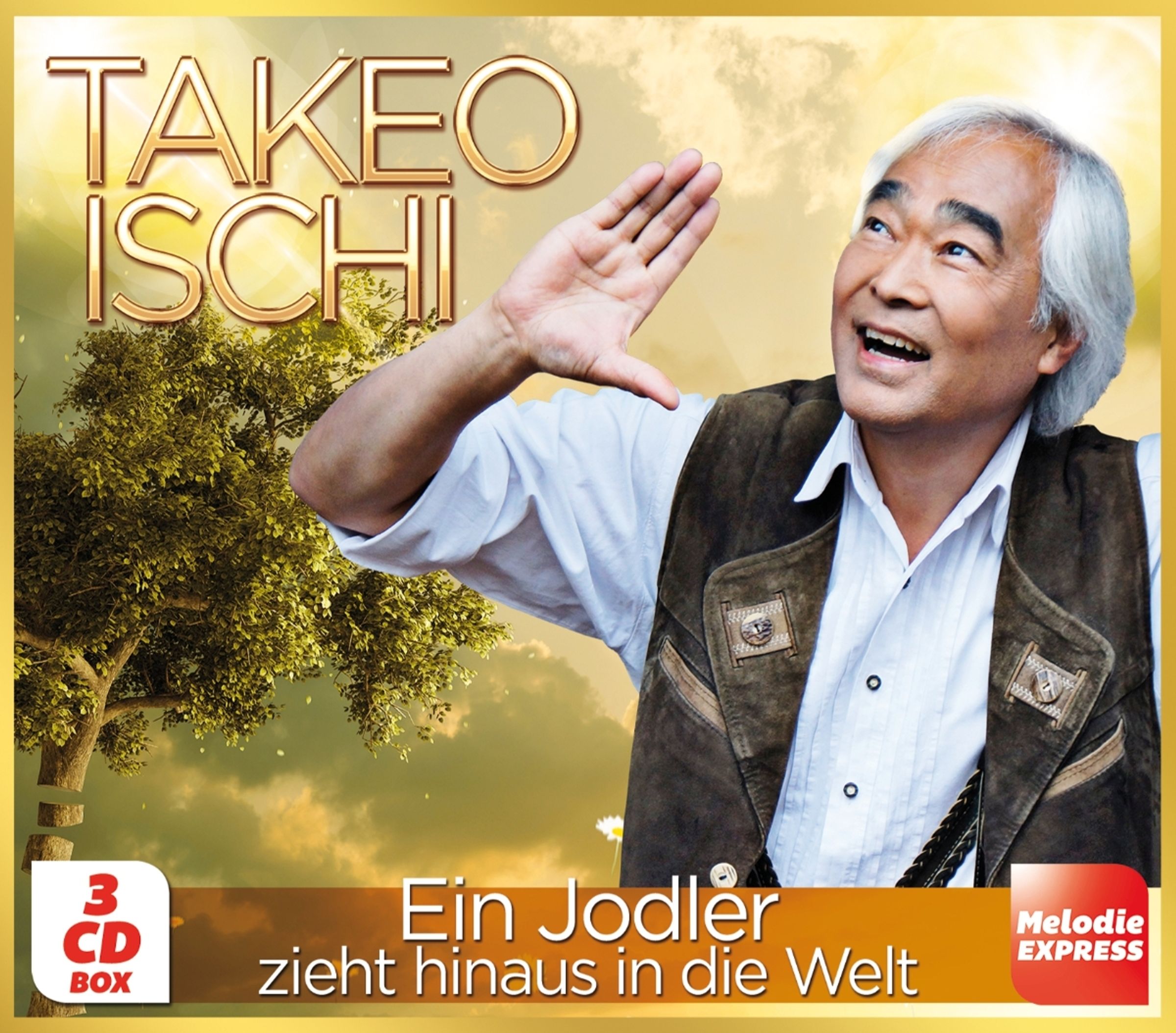 Texte: "TAKEO ISCHI", "Ein Jodler zieht hinaus in die Welt", "3 CD BOX", "Melodie EXPRESS". Mann in Lederweste vor Baum., 3 CDs
