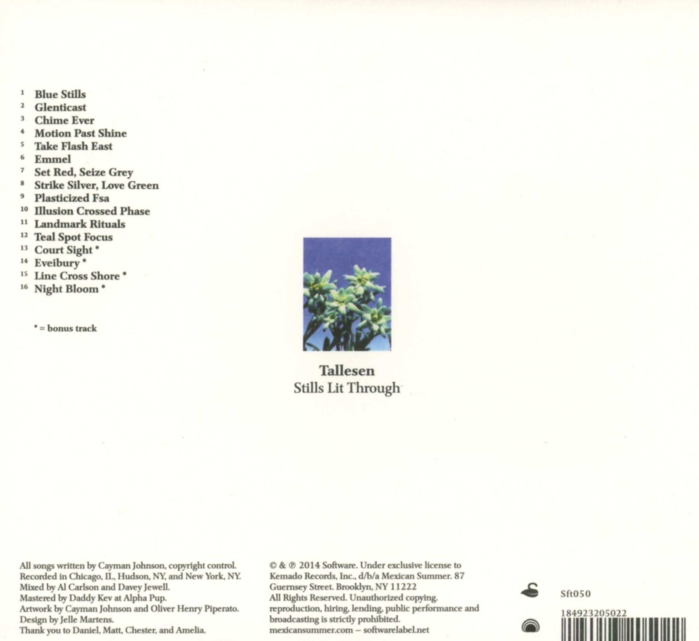 Stills Lit Through offers the first comprehensive body of work from musician and visual artist Tallesen. Hailing from the Hudson Valley of New York, Tallesen - born Cayman Johnson – describes Stills as a response to the »continuous flexibility of the physical setting by the additive of sound«. A reference to his joyful erasure of the distinction between music and experience. The twelve songs of Stills Lit Through conjure an eidolon of melodies painted with watercolor brushstrokes both calm and frenetic. To our ears, this closely characterizes Johnson's work as a visual artist. The collection when taken as a whole is wonderfully consistent. We hear echoes of Autechre’s corporeal maneuvers (bass as lead voice, plasticity of foreground vs. background), but, if you dig out the provenance of Johnson's nom de plume, you really start to understand how the melodic through-lines of the record operate on a more illustrative level.