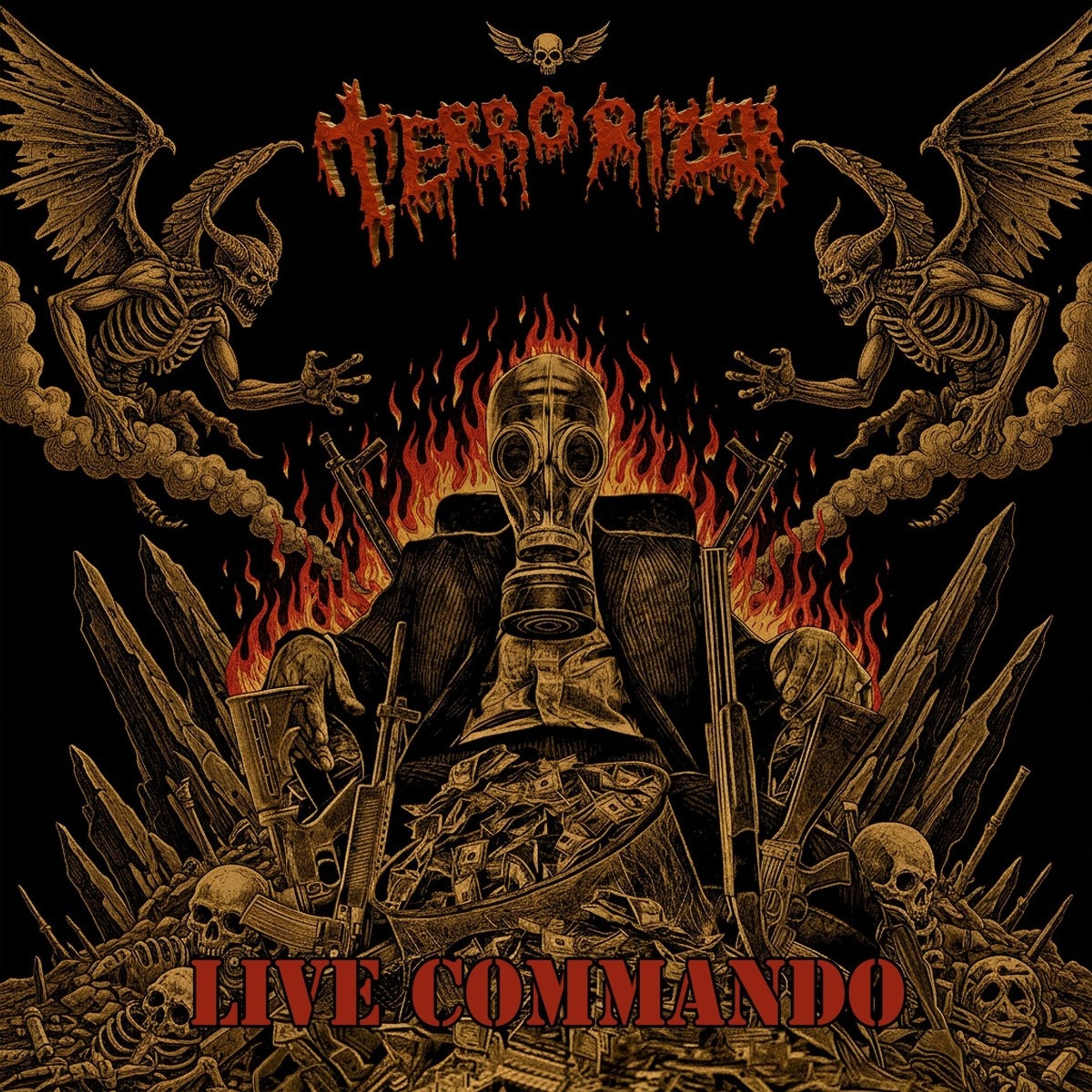 „TERRORIZER“ und „LIVE COMMANDO“ in Flammen. Maskierter Mann, Waffen, Geld, Skelette und Dämonen in einer düsteren Szene., CD