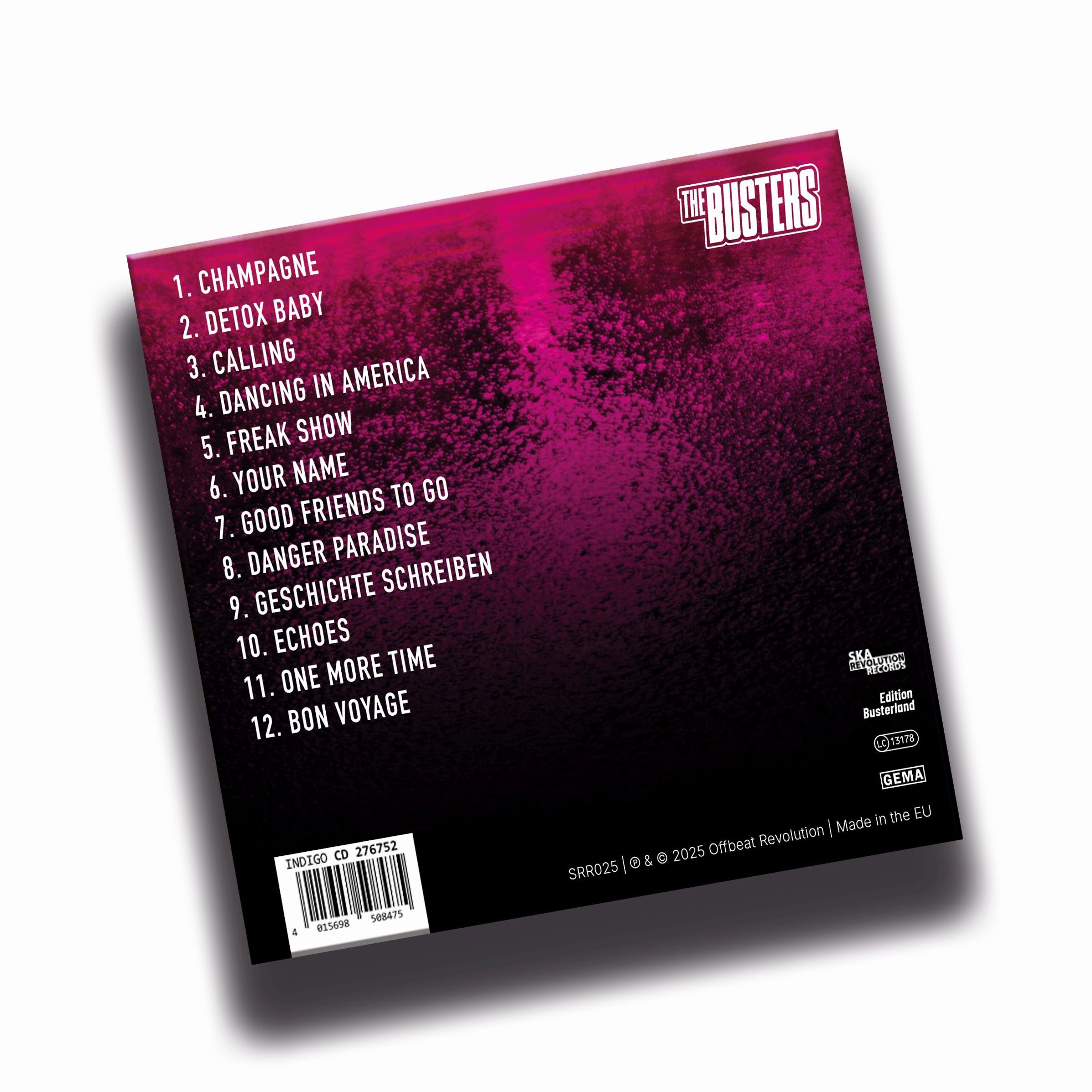 „THE BUSTERS“ und „CALLING“ in leuchtendem Pink. Eine Gruppe von Männern in dunkler Kulisse., CD
