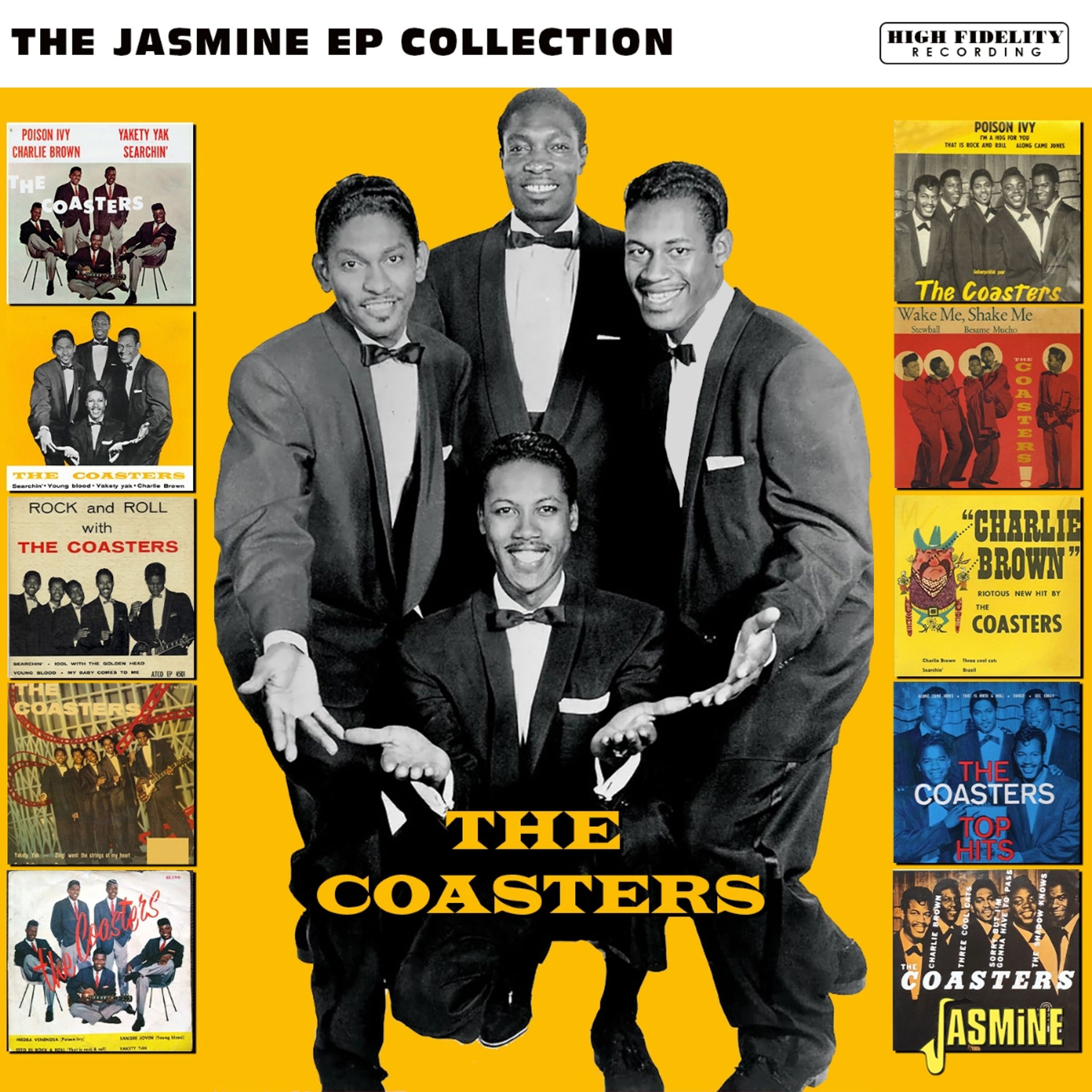 "The Coasters" in gelbem Text auf Schwarz-Weiß-Foto von vier Männern in Anzügen vor gelbem Hintergrund. Links und rechts EP-Cover., CD