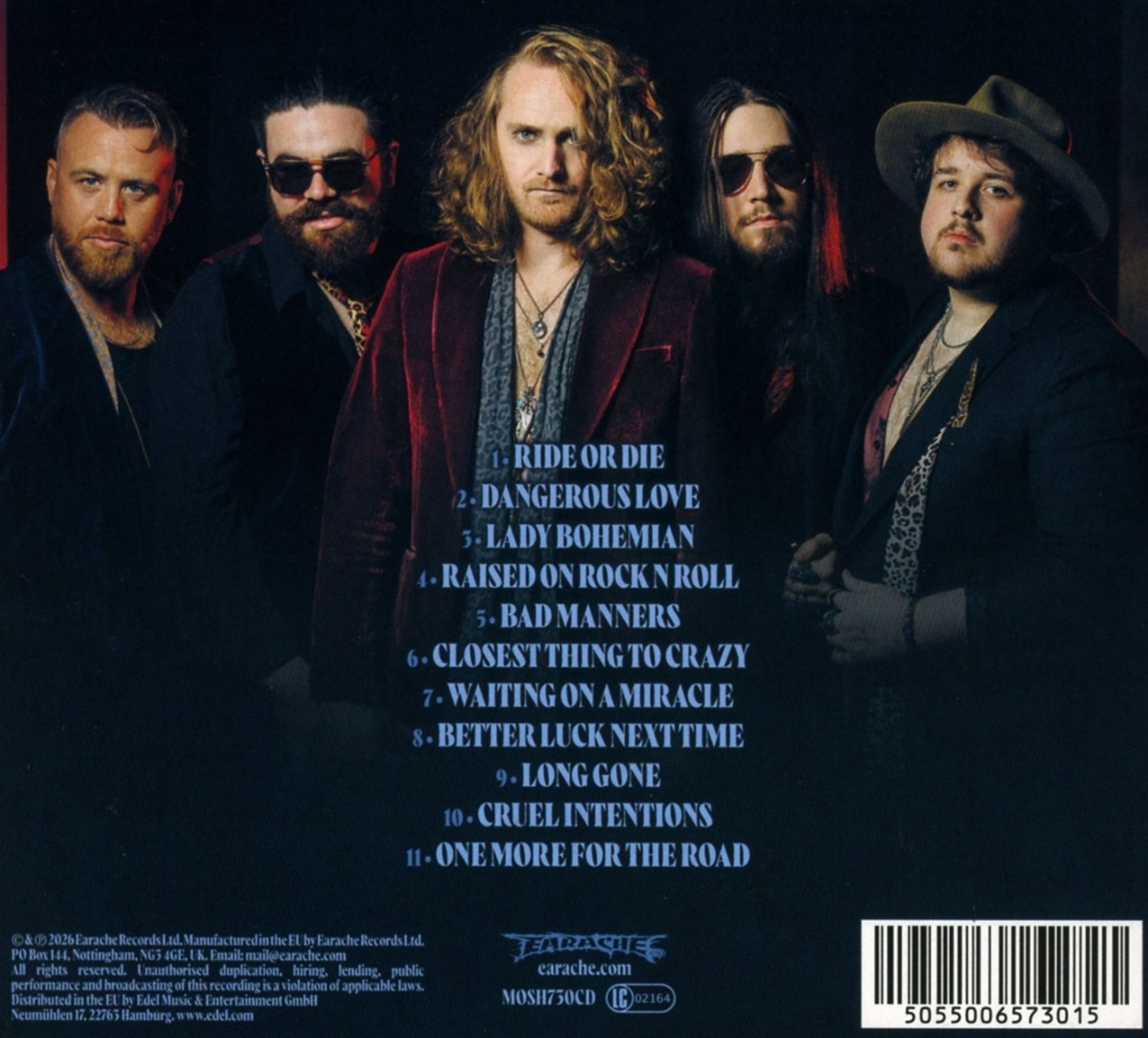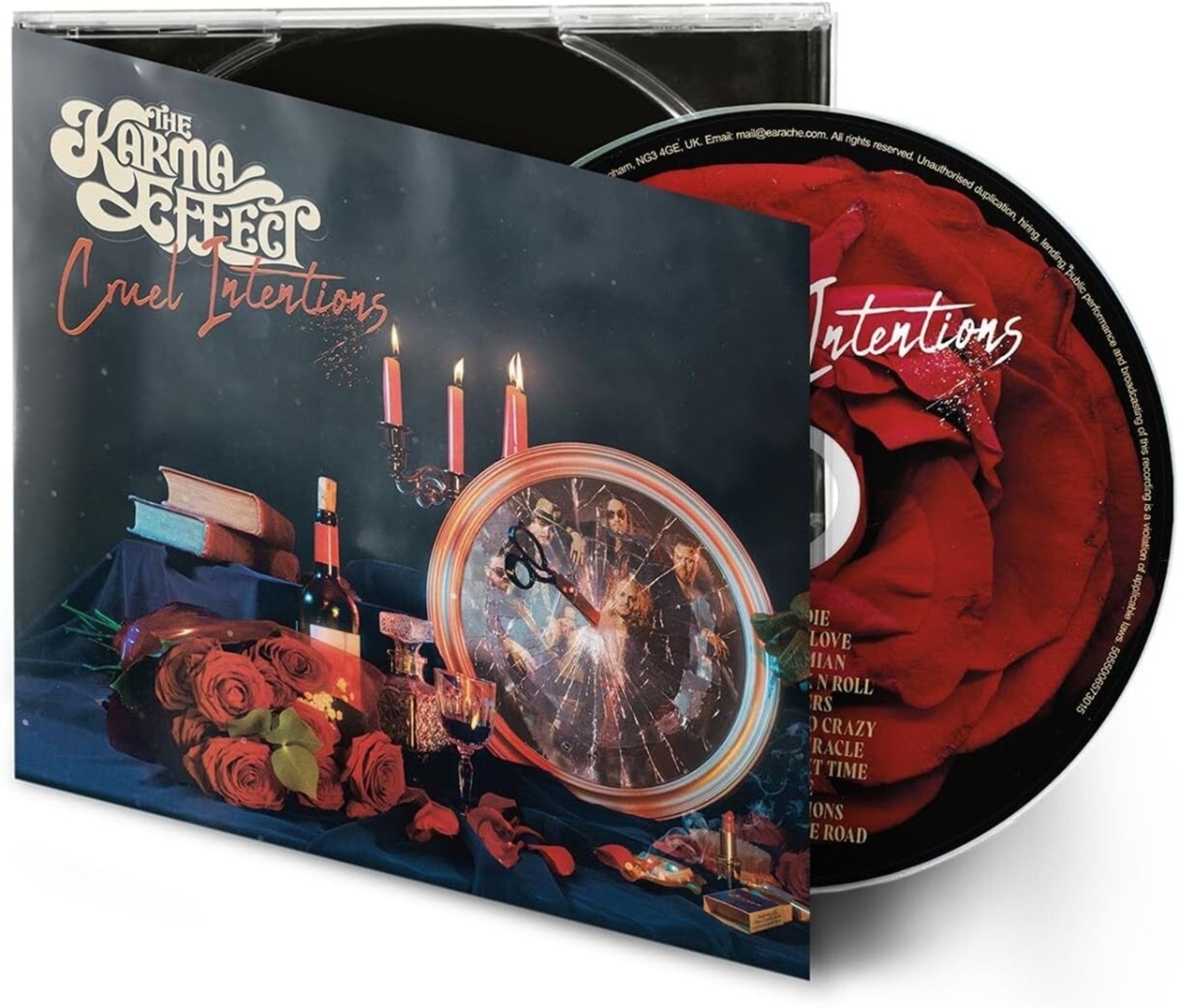 Text: „The Karma Effect“, „Cruel Intentions“. Illustration mit Rosen, Wein, Büchern und einer kaputten Uhr., CD