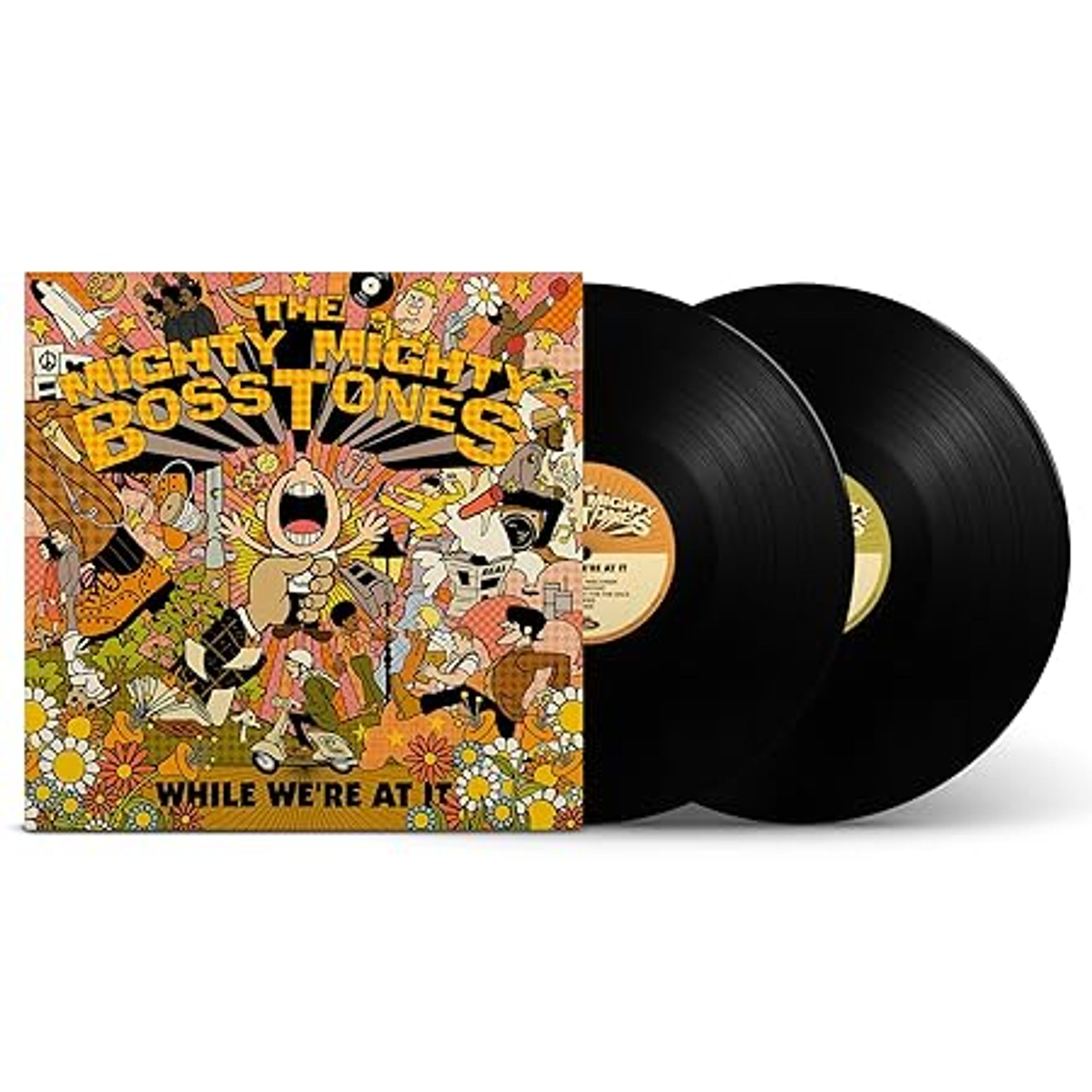 "The Mighty Mighty Bosstones" und "While We're At It" auf einem farbenfrohen Albumcover neben zwei Schallplatten., 2 LPs