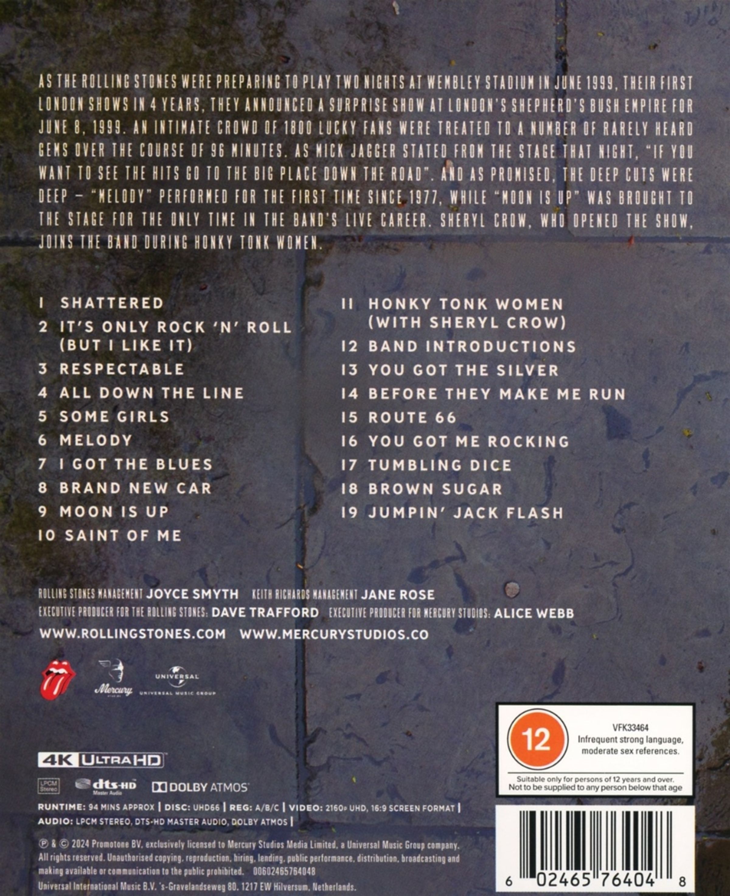 Diese Show wurde 1999 im Shepherd's Bush in London gefilmt, nur wenige Tage vor zwei ausverkauften Konzerten im Wembley-Stadion. Diese intime Show enthält eine Reihe von tieferen Ausschnitten aus dem Katalog der Band, einschließlich der ersten und einzigen Aufführung von »Moon Is Up« (ursprünglich auf dem Album »Voodoo Lounge« veröffentlicht) und einer ebenfalls sehr seltenen Performance von »Melody«. Weitere Raritäten sind »I Got The Blues« und »Brand New Car«.