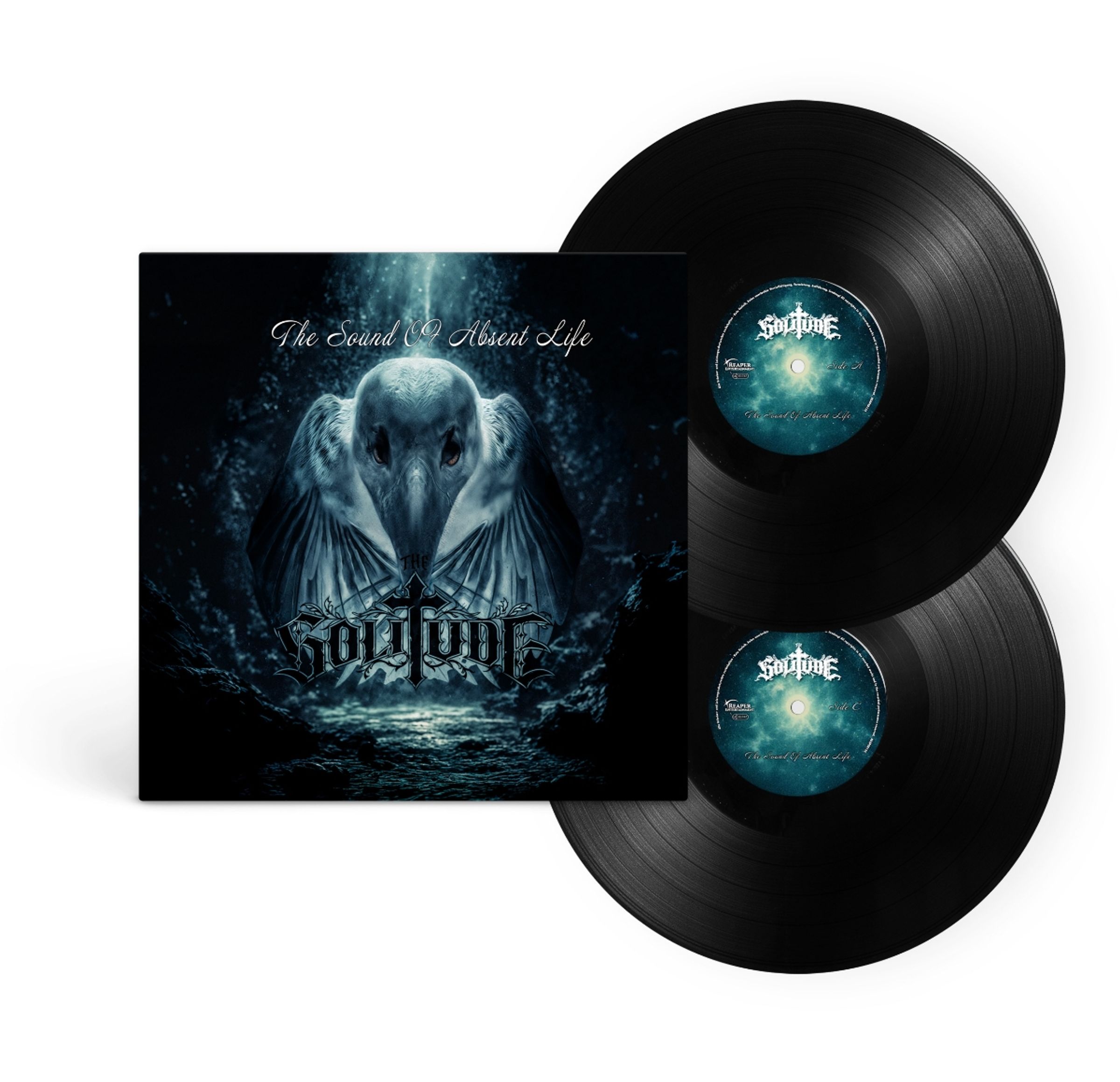 Text: "The Sound of Absent Life", "Solitude". Zwei schwarze Vinyl-Schallplatten, mystische Illustration eines Vogels., 2 LPs