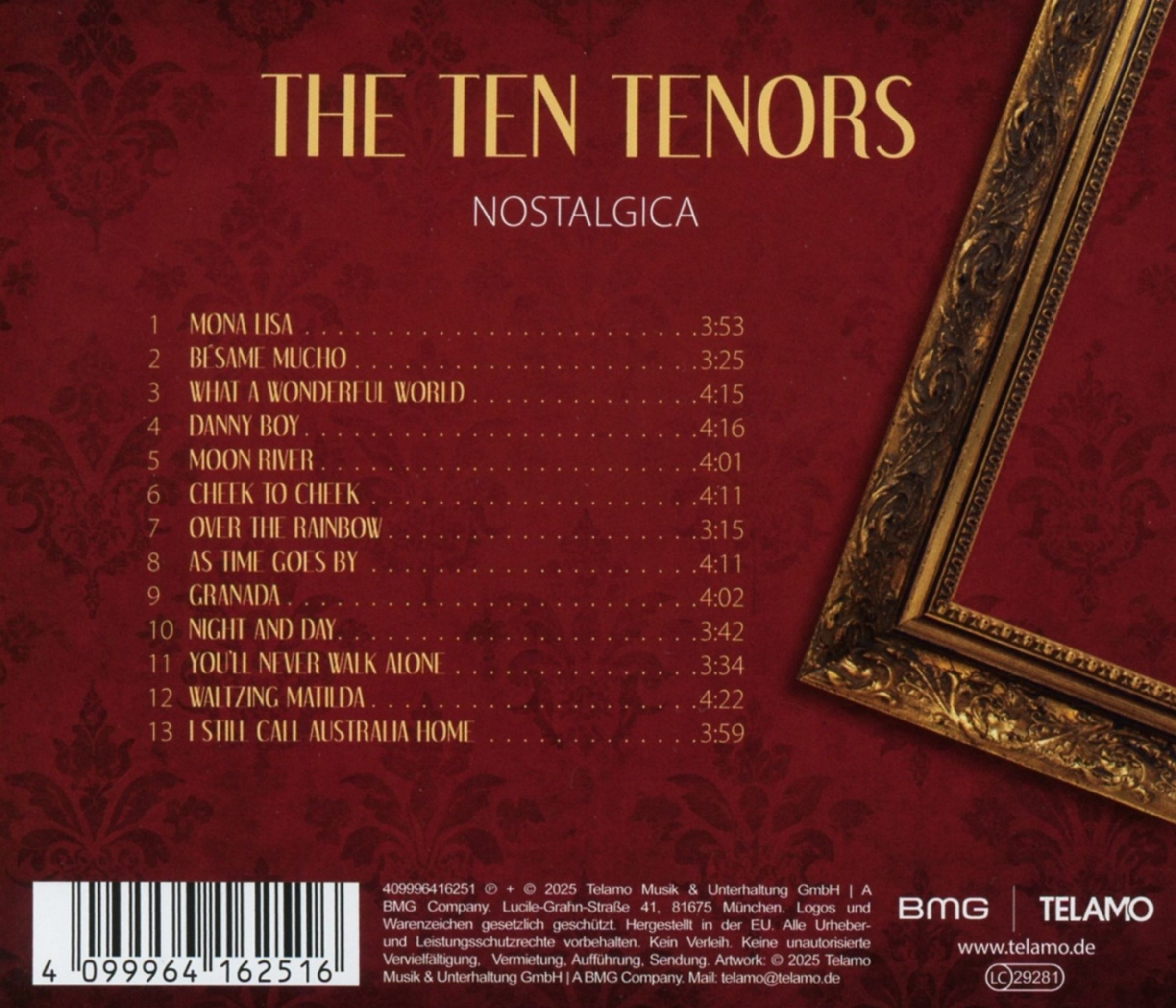 Zwei Jahre nach ‚Here’s to the Heroes’ erscheint Mitte August das siebte Album der Australier: Nostalgica. Die musikalische Zeitreise wurde von Star-Produzent Simon Franglen (Céline Dion, Toni Braxton) – der auch schon auf der vorherigen CD mitgewirkt hat - mit viel Verve in Szene gesetzt. Zehn Monate im Jahr reisen die Australier rund um den Globus, mehr als 31 Mio. Menschen haben bisher ihre großartigen Shows gesehen. 12 hochkarätige Songjuwelen intonieren die 10 Stimmwunder auf ihrem neuen Album Nostalgica, darunter Klassiker wie Moon River, Bésame Mucho oder You’ll Never Walk Alone, die The Ten Tenors mit viel Leidenschaft und mitreißender Frische interpretieren. Auf ihrer derzeitigen Europatour gastieren The Ten Tenors im August 14 Tage im Hamburger Schauspielhaus, um Nostalgica ihren Fans erstmals live zu präsentieren.