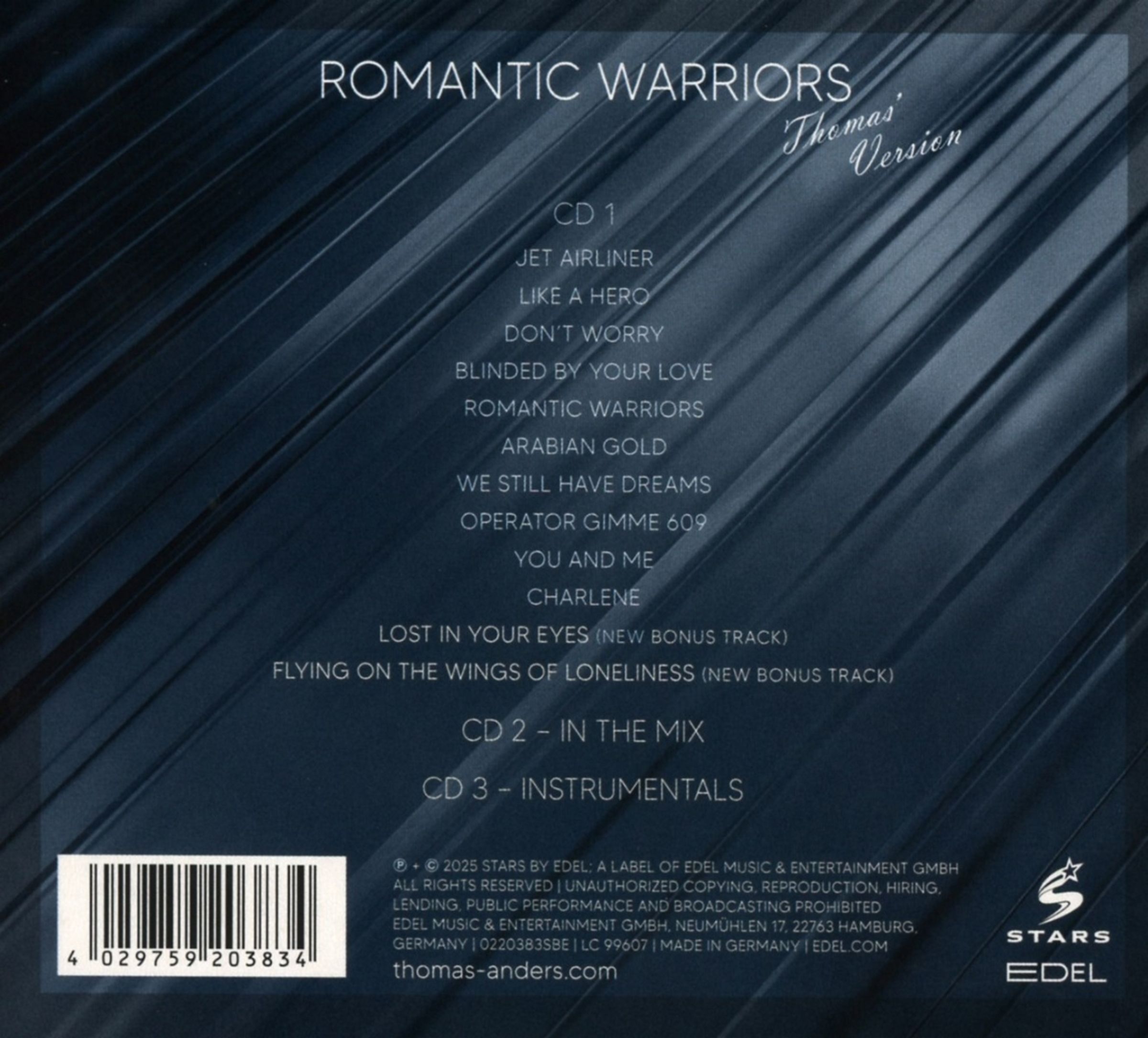 Brandneue Aufnahmen plus neue Bonustracks. Nach den ersten vier Top-5-Charterfolgen aus der Jubiläumsreihe präsentiert Thomas Anders nun Album # 5. »Romantic Warriors« ist ab Oktober 2025 erhältlich und war schon bereits in 1987 ein Top-3-Erfolg in den deutschen Charts!