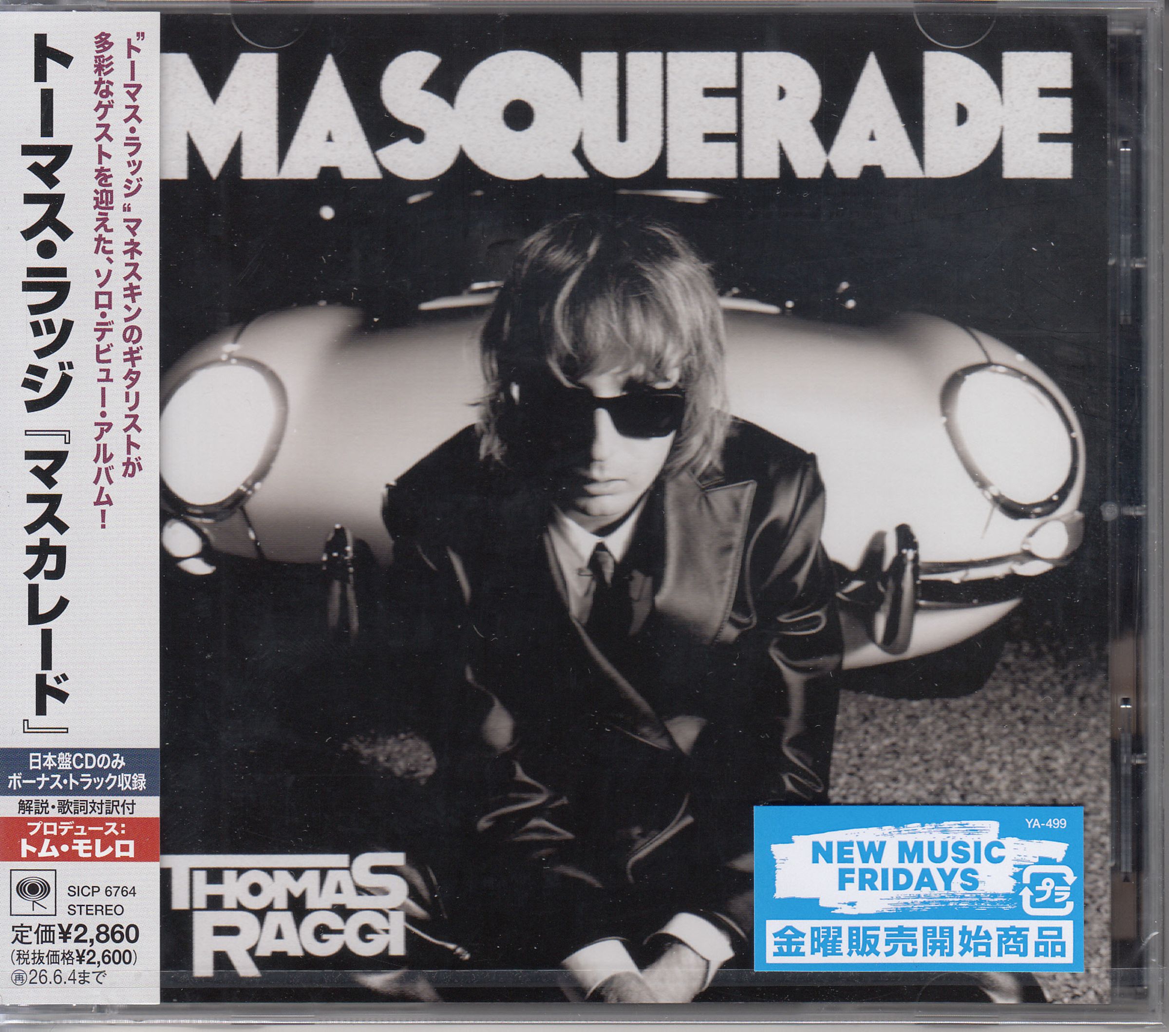 "MASQUERADE", "THOMAS RAGGI". Schwarz-Weiß-Foto: Person mit Sonnenbrille vor einem Oldtimer. Japanische Schriftzeichen., CD