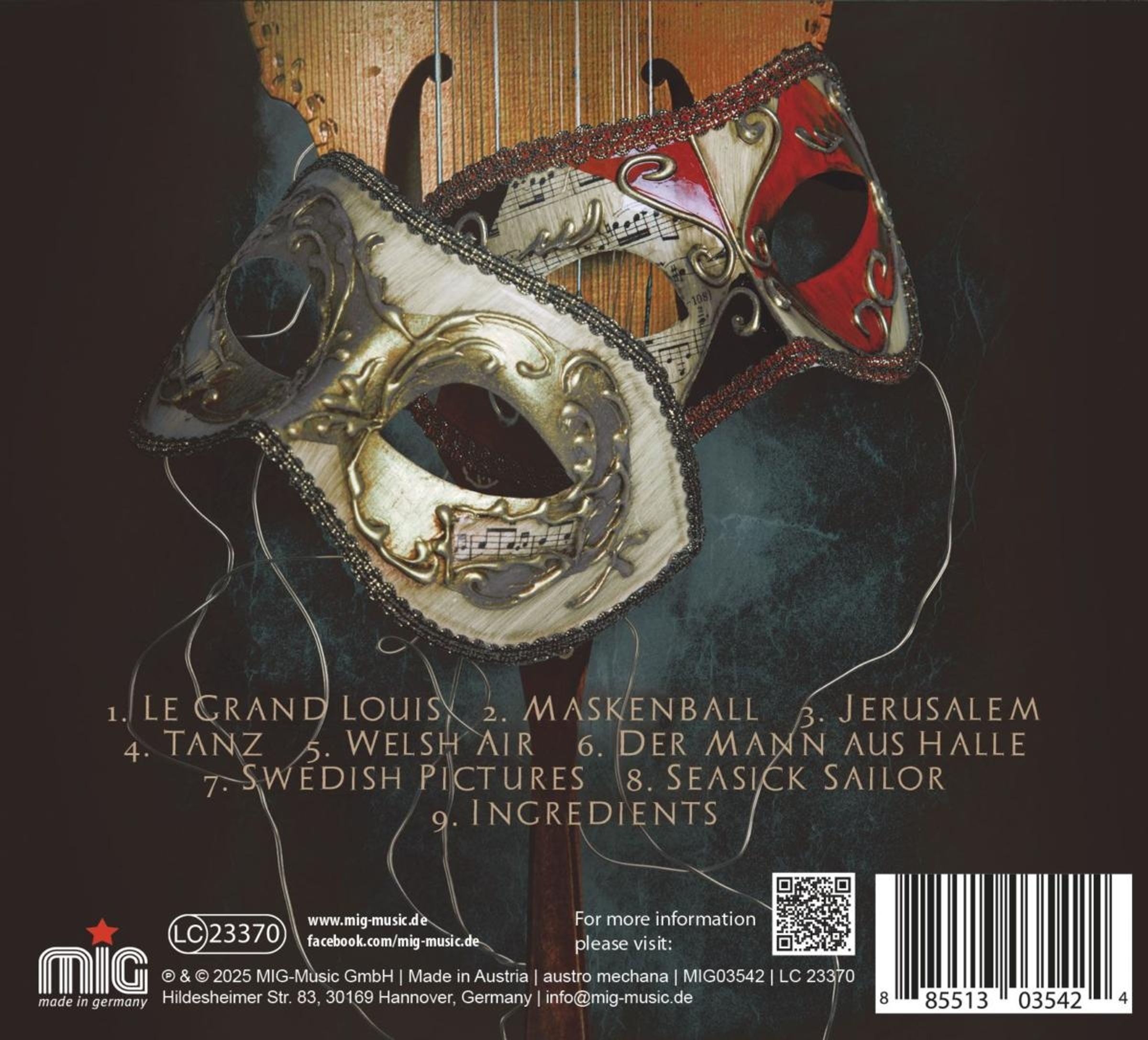 Text: "thomas roth MASKENBALL". Illustration einer traditionellen Laute und bunten Karnevalsmasken., CD