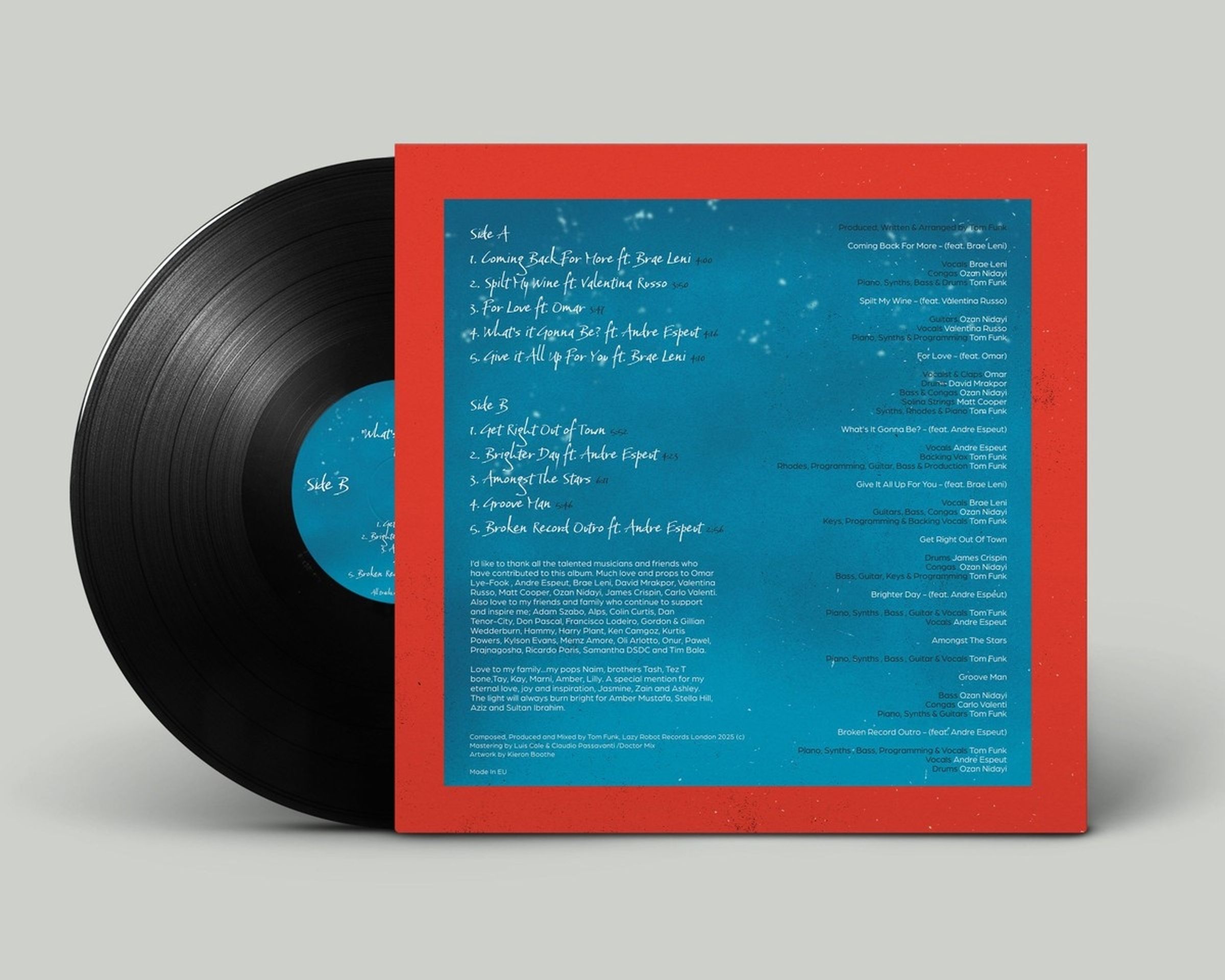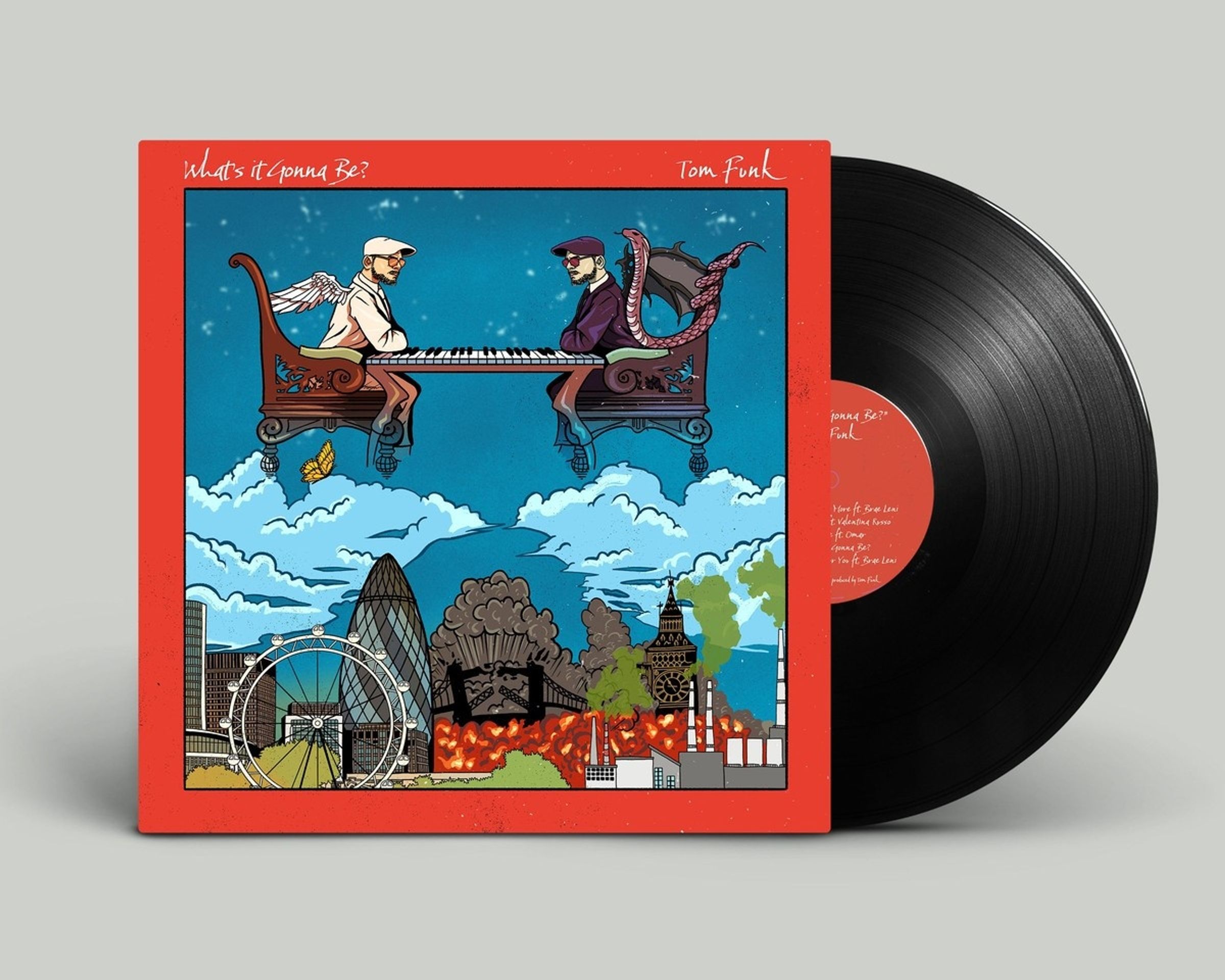 Text: "What's it Gonna Be?" und "Tom Funk". Illustration: Zwei Figuren auf einem schwebenden Klavier, London im Hintergrund., LP