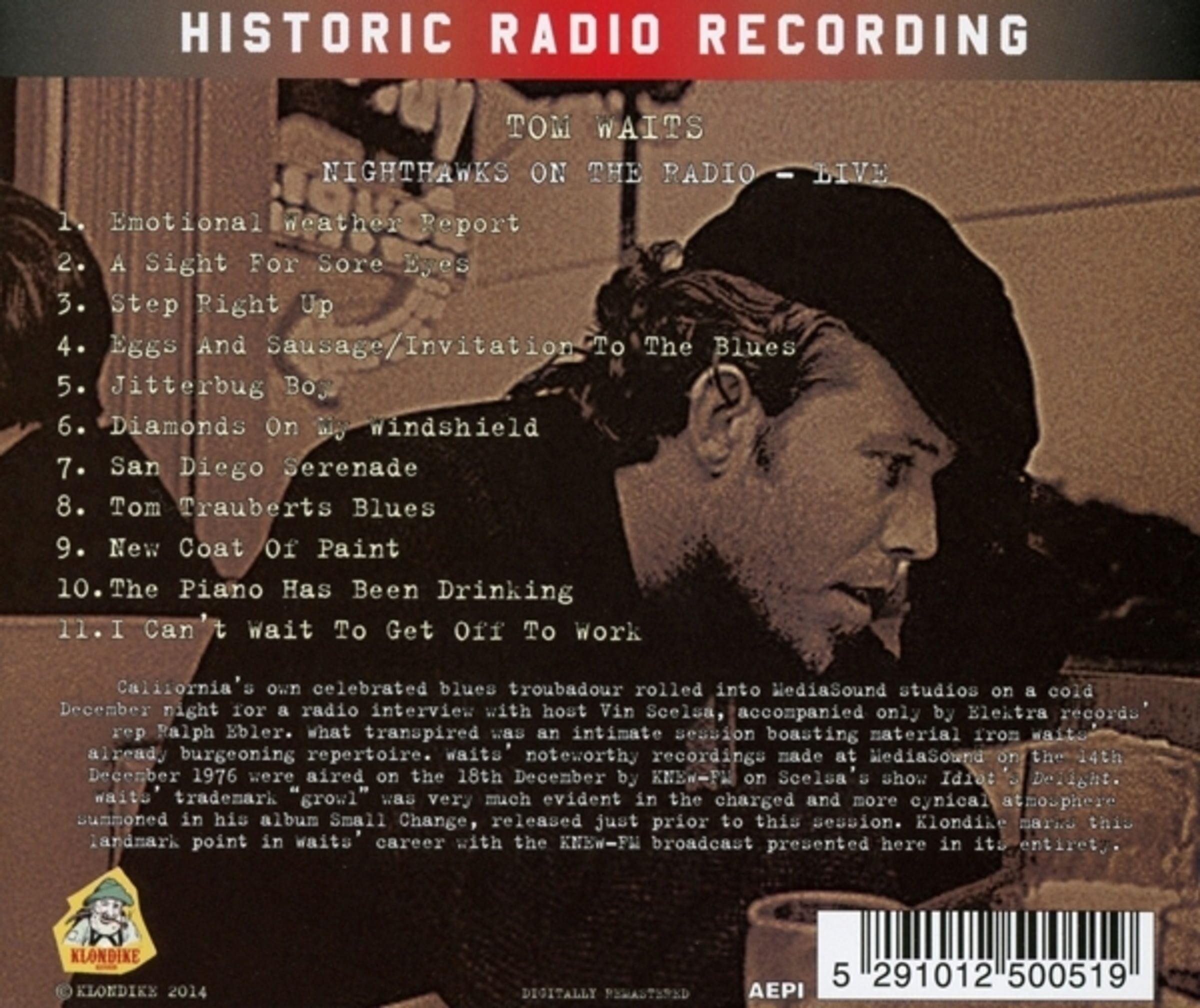 Das Album »Small Change« war just veröffentlicht, als der große kalifornische Blues-Troubador im Dezember 1976 in die Mediasound Studios spazierte, um ein Radio-Interview mit Vin Scelsa zu führen, begleitet von Elektra-Repräsentant Ralph Ebler. Es entstand eine sehr intime Session bei der Waits auch Songs aus seinem bis dato veröffentlichten Repertoire zum Besten gab, die wiederum am 18. Dezember von KNEW-FM gesendet wurden – in Scelsa’s Radio Show »Idiot’s Delight«. Klondike bringt nun den kompletten Radio-Mitschnitt als Remaster inkl. Linernotes.