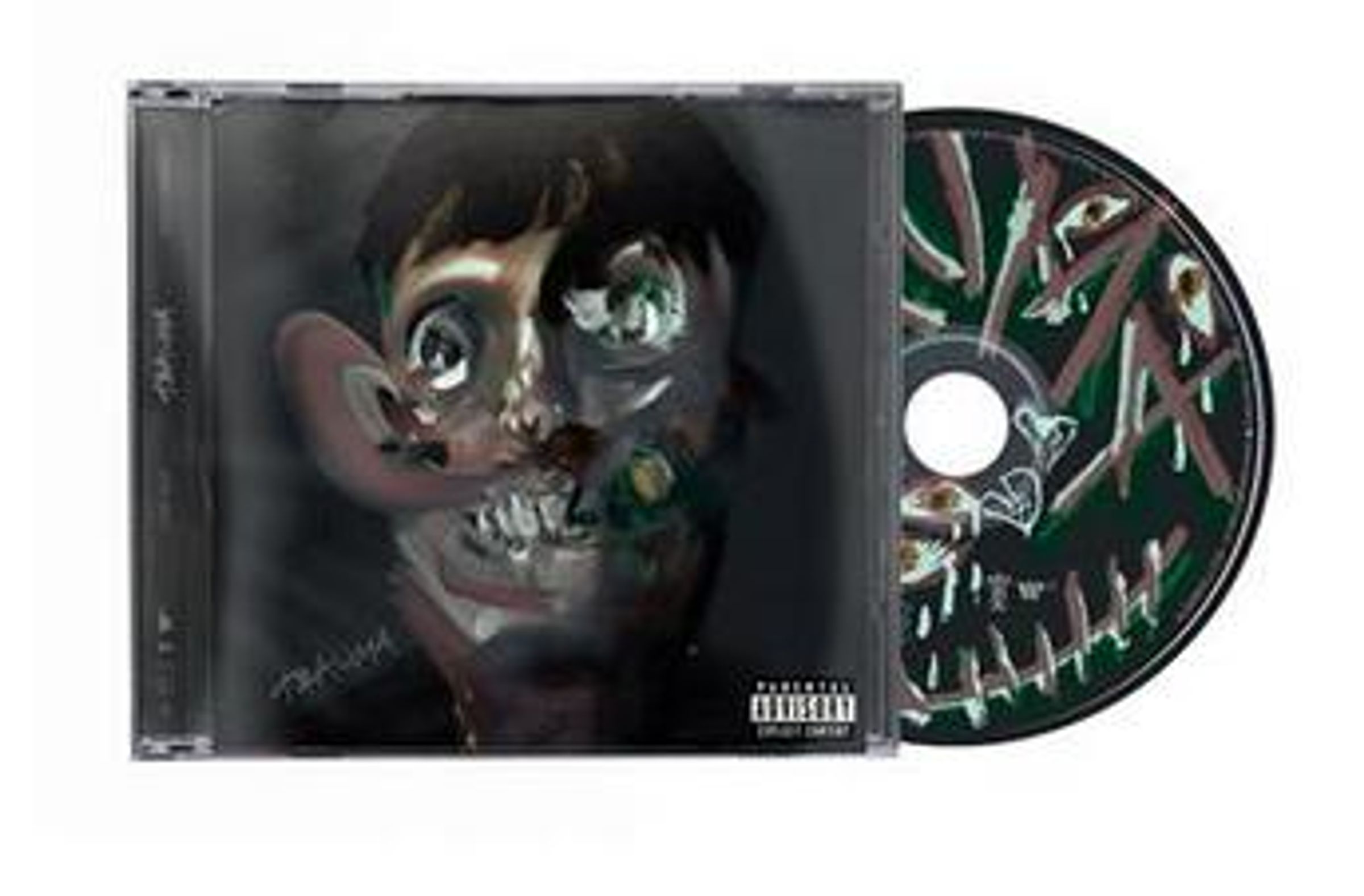 Das Cover zeigt den Text "Parental Advisory Explicit Content". Ein verzerrtes, surrealistisches Porträt ziert Cover und CD., CD