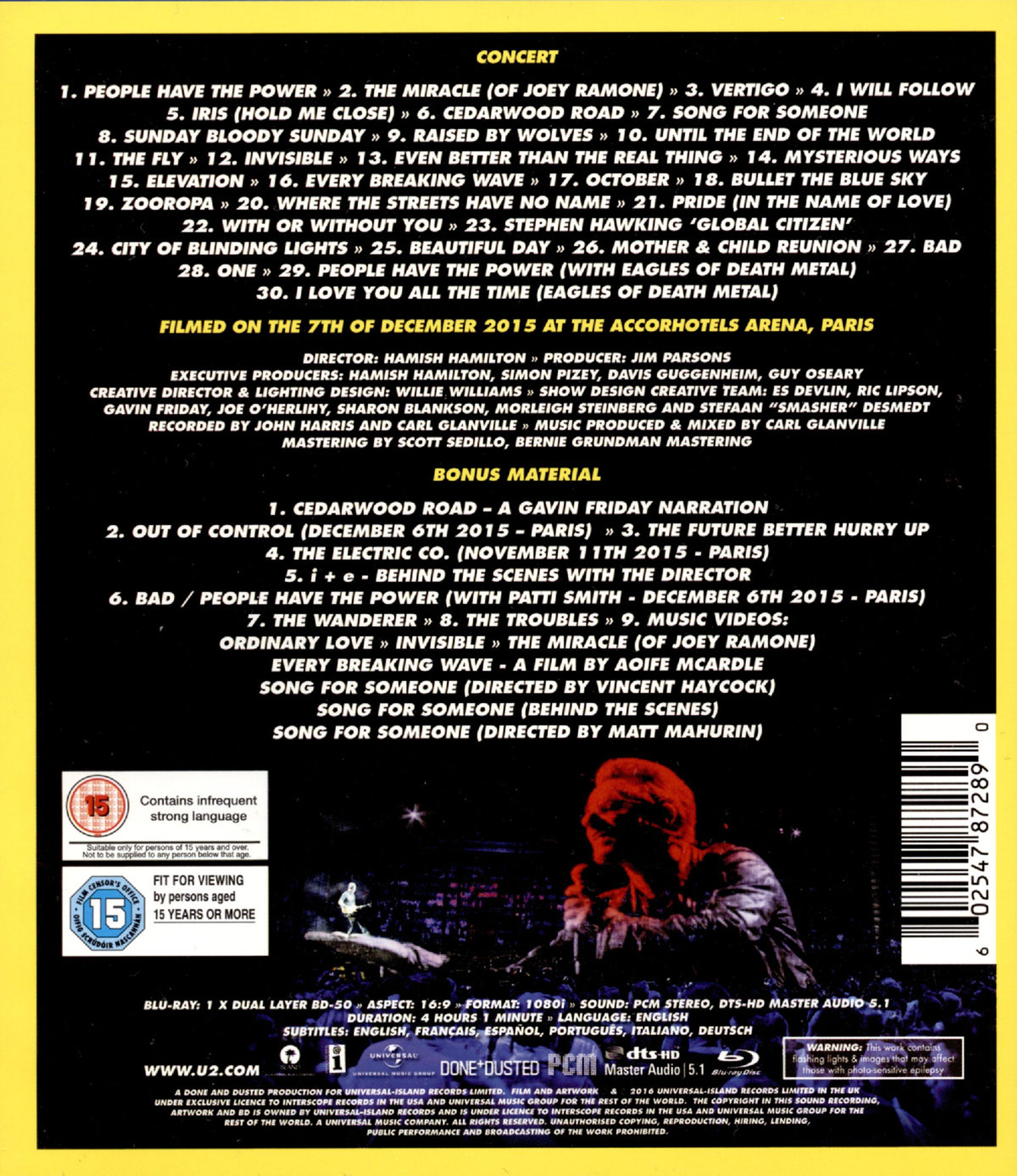 Den filmischen Mitschnitt dieses Konzertes gibt es jetzt mit »U2 iNNOCENCE + eXPERIENCE Live in Paris«. Ganze 30 Songs umfasst die Performance, darunter Klassiker wie »Sunday Bloody Sunday«, »Beautiful Day« und »Pride (In The Name Of Love)« sowie zahlreiche neue Hits, zum Beispiel »Invisible«, »The Miracle (Of Joey Ramone)« und »Every Breaking Wave«.