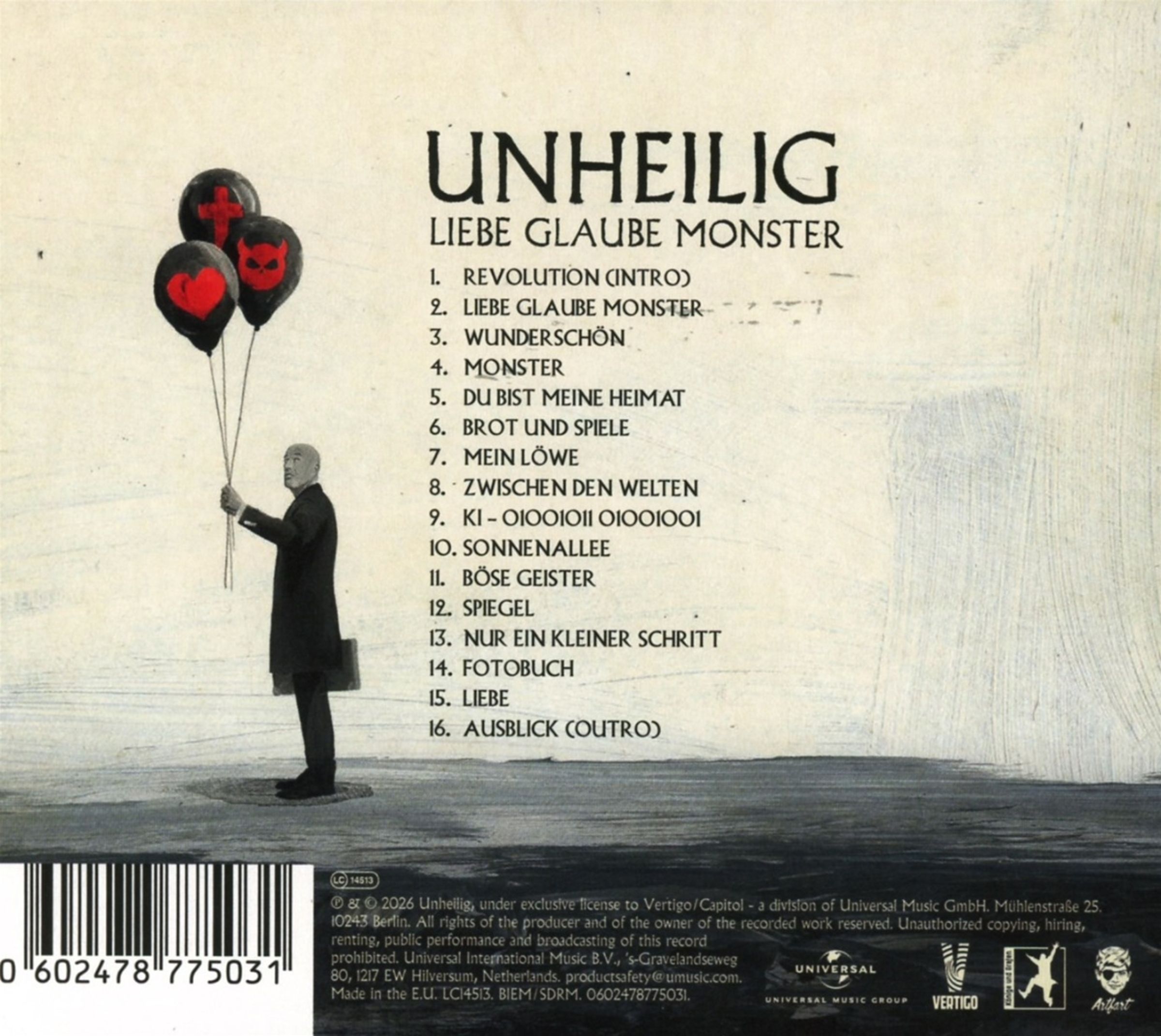Mit dem 2026 erscheinenden Album »Liebe Glaube Monster« knüpfen Unheilig dort an, wo sie 2016 aufgehört haben. Die insgesamt 16 neuen Songs des Konzeptalbums widerspiegeln die Gedanken, Erlebnisse und Emotionen des Grafen, die er in den ausnahmslos von ihm selbst geschriebenen Texten verarbeitet. Die Schlagworte des Albumtitels ziehen sich als Leitmotive durch das berührende Gesamtwerk und spannen die Bögen zwischen den verschiedenen Dimensionen, die Unheilig auszeichnen. Auf dem Album geht es um Liebe, Freundschaft, Hoffnung, Zuversicht und auch um die Monster, denen wir uns alle im Leben stellen müssen.