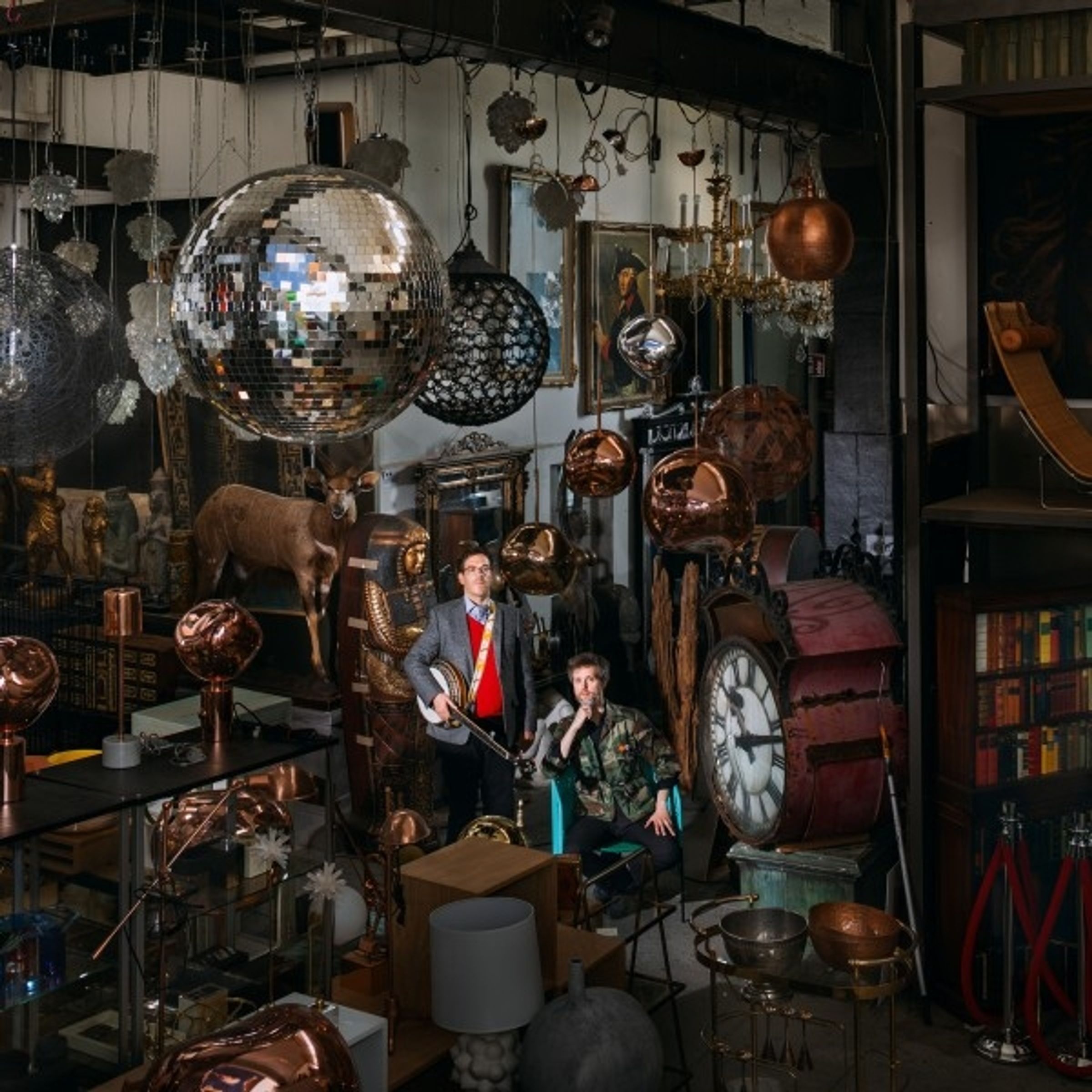 Zwei Personen in einem vollgestellten Raum mit Spiegelkugeln, antiken Uhren, Kupferlampen und einem Hirschkopf., LP