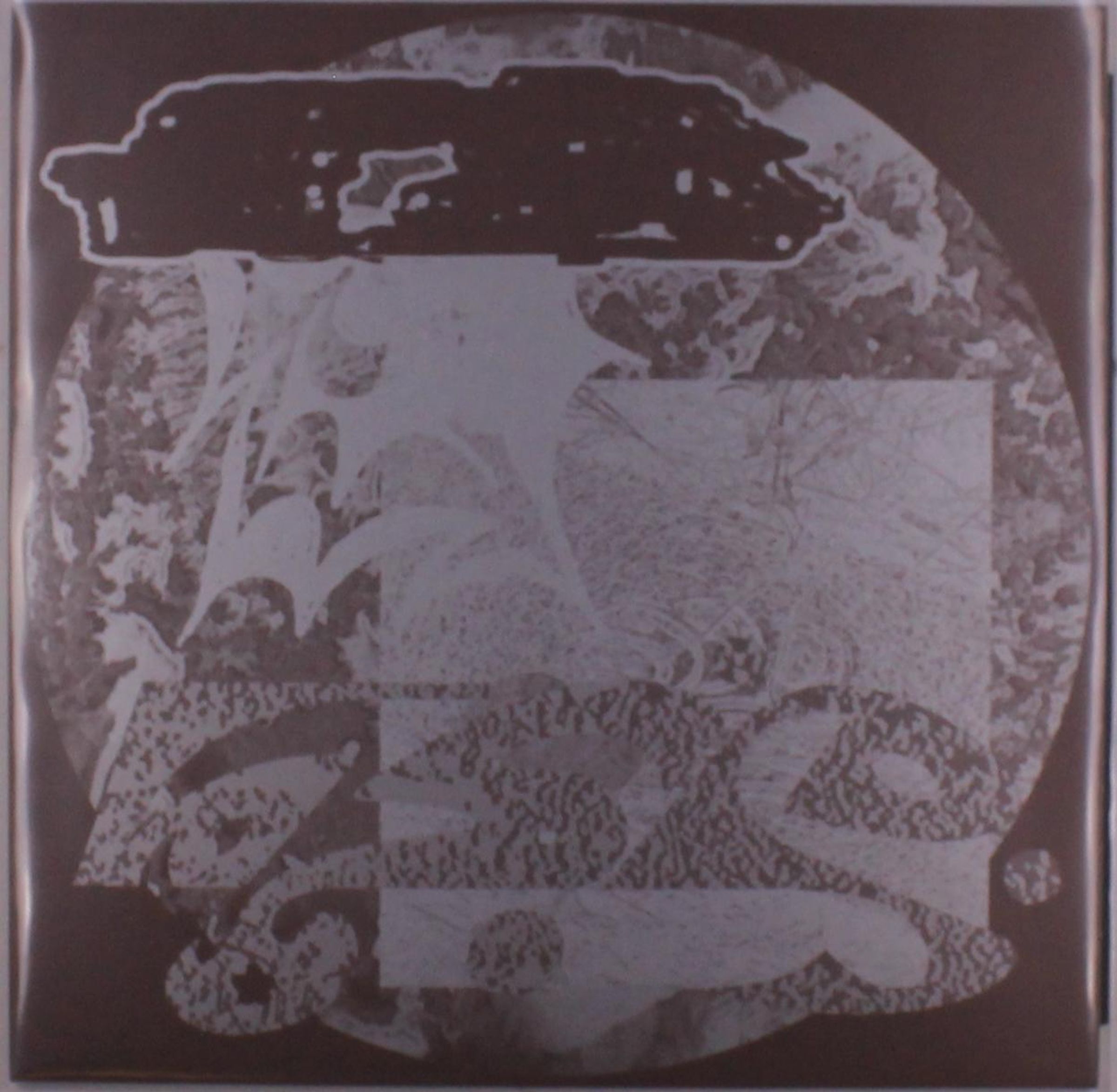 Unlesbare, überlagerte Texte in einem abstrakten, dunklen Design mit kreisförmigen und eckigen Mustern., Single 12"