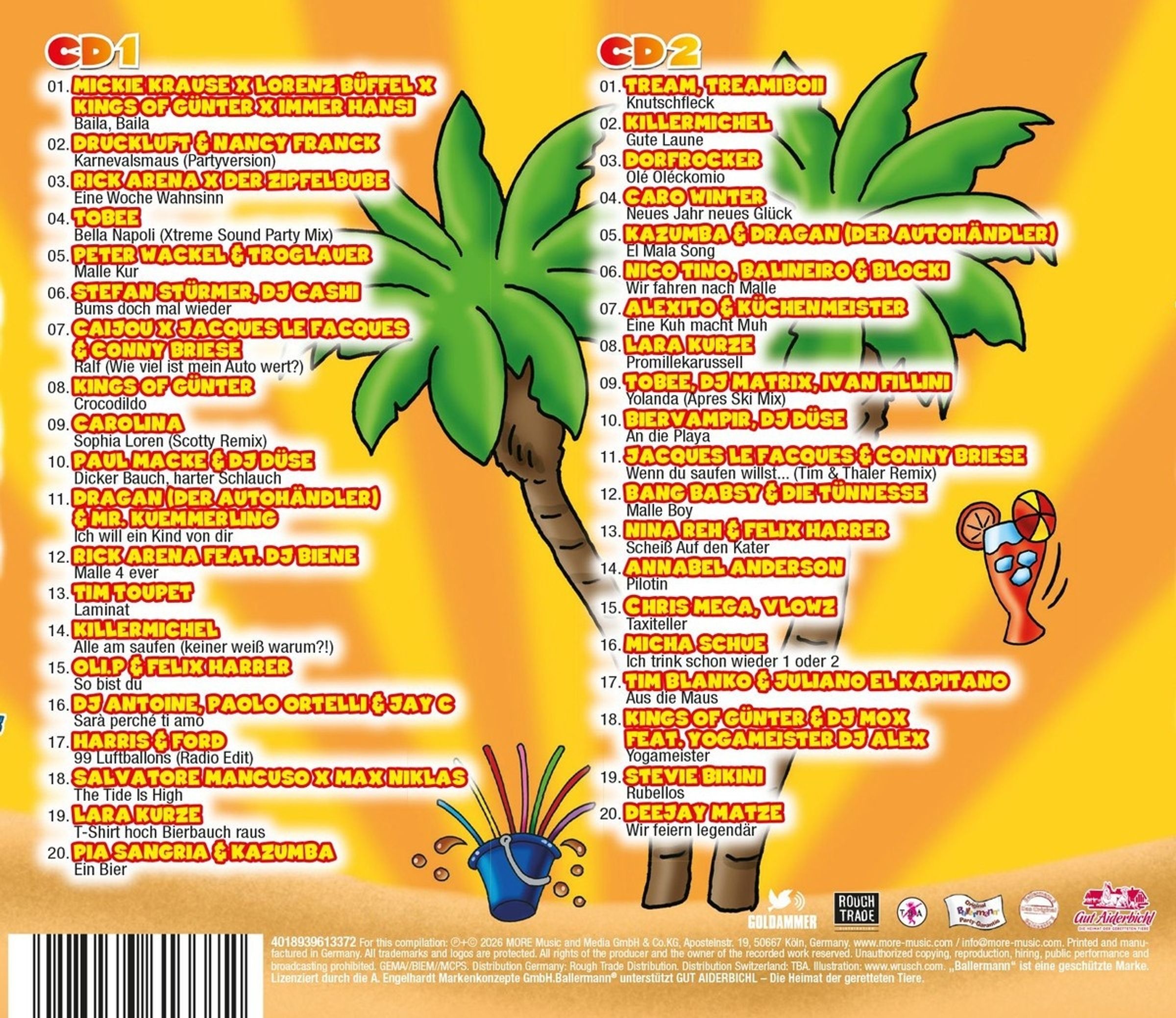 Sommer, Sonne, Feiern, Partyhits - kein anderer Ort steht so sehr für Partyeskalation wie die Playa De Palma auf Mallorca, der Ballermann! Wer hier im Sommer Urlaub macht, will feiern, tanzen, trinken und mitsingen bis zum Gehtnichtmehr. Die Compilation »Ballermann 2026: Die Hits der Insel« hat alle Hits, die diese Saison in den einschlägigen Party Locations angesagt sind und die auch die heimischen Clubs, Partys und Sommerfeste zum Brodeln bringen werden.