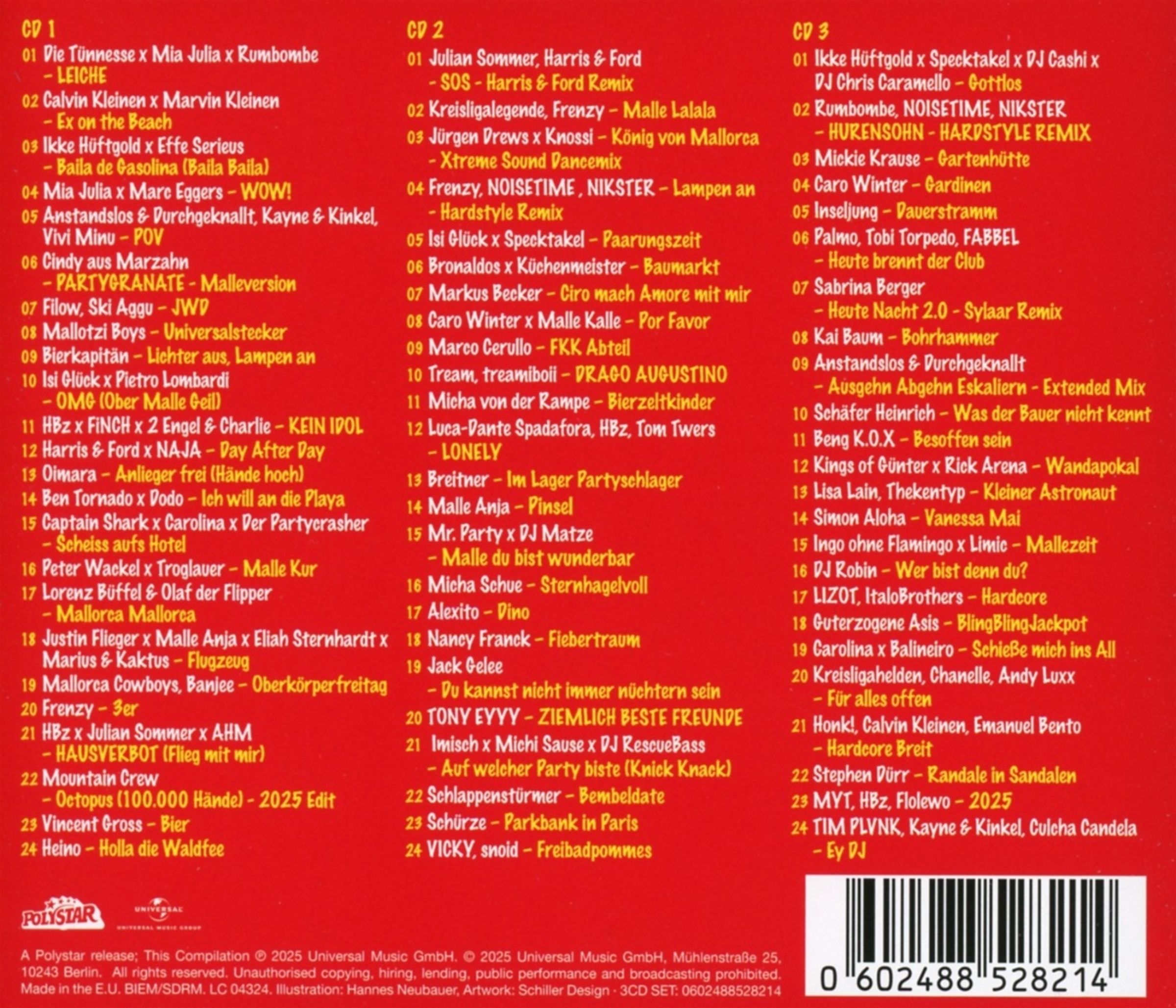 Die Ferien sind zwar zu Ende, aber der Ballermann feiert weiter! Zumindest auf 3CDs mit weiteren brandaktuellen, partytauglichen Mitsing-Hymnen zum Abfeiern. Mia Julia, Julian Sommer, Jürgen Drews, Frenzy, Oimara, Ski Aggu, Isi Glück u. v.m. geben vor dem großen Closing Ende Oktober nochmal alles.