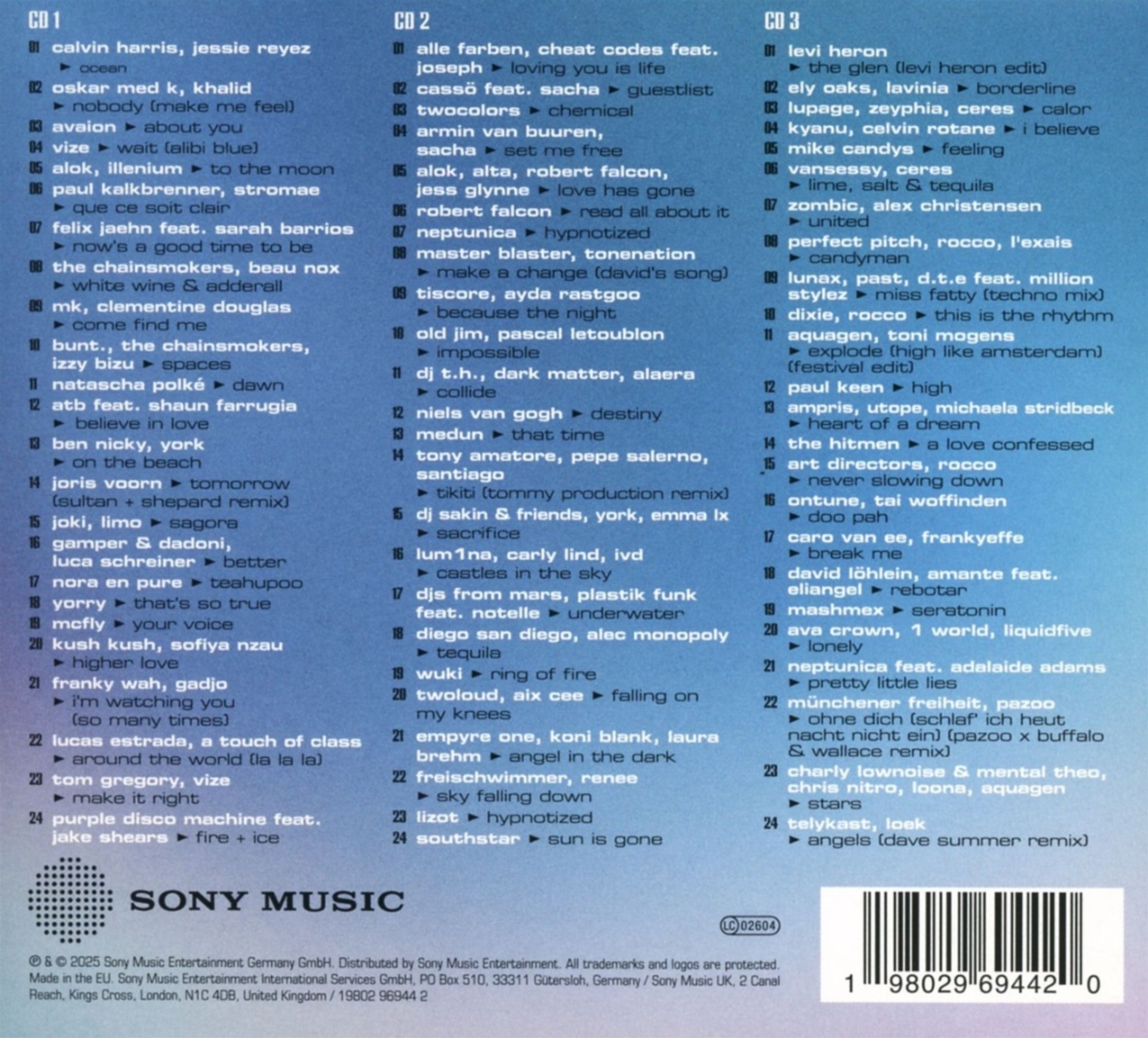 3CDs mit 72 Tracks im schicken Digipack - vollgepackt mit dem Besten was die elektronische Musik zu bieten hat! Mit Calvin Harris - Ocean, oskar med K, Khalid - nobody (make me feel), MK, Clementine Douglas - Come Find Me, Levi Heron - The Glen, Paul Keen - High.