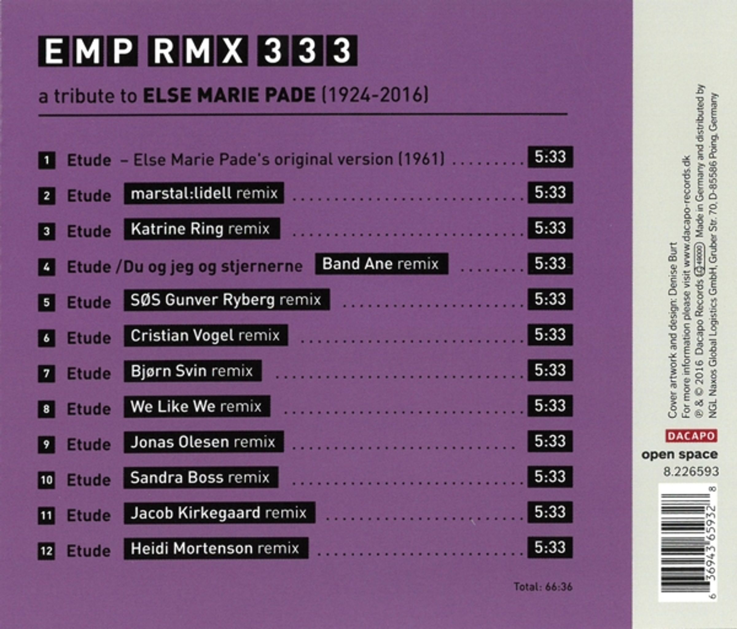 333 Sekunden lang ist das Werk, und als Hommage an Else Marie Pade haben elf Künstler Etude auf dieser CD neu abgemischt - alle elf Remixe haben die gleiche Dauer wie das Original.