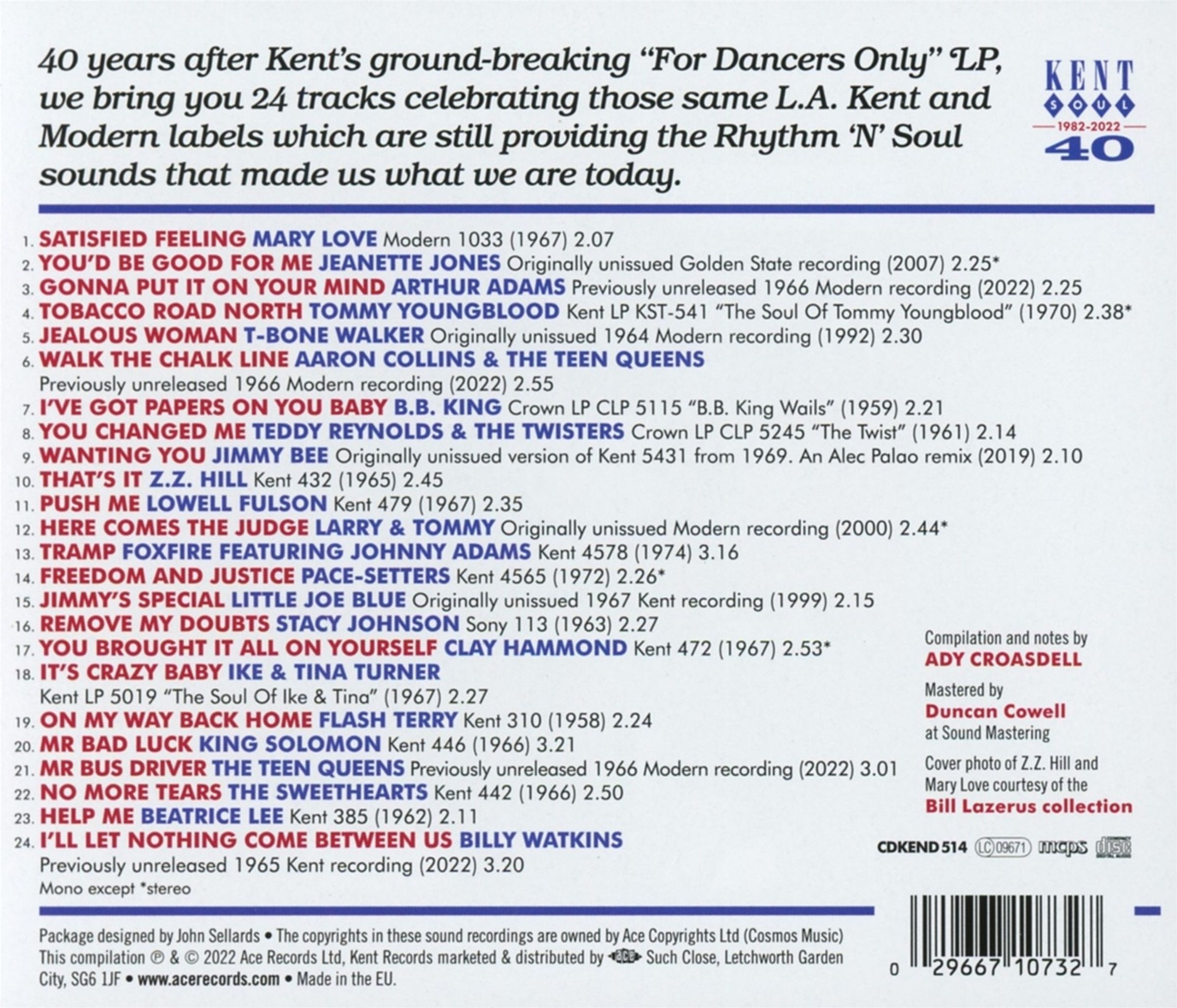 'For Dancers Forty' feiert 40 Jahre seit der bahnbrechenden LP 'For Dancers Only', und greift wieder diverse Labels in Los Angeles auf. Wie auf der legendären KENT 001 repräsentiert die Compilation wieder Soul Stomper, Rhythm & Blues-Buster, 60s Grooves und himmlische Harmonien. 24 Tracks, umfangreiche, äußerst informative Liner Notes!