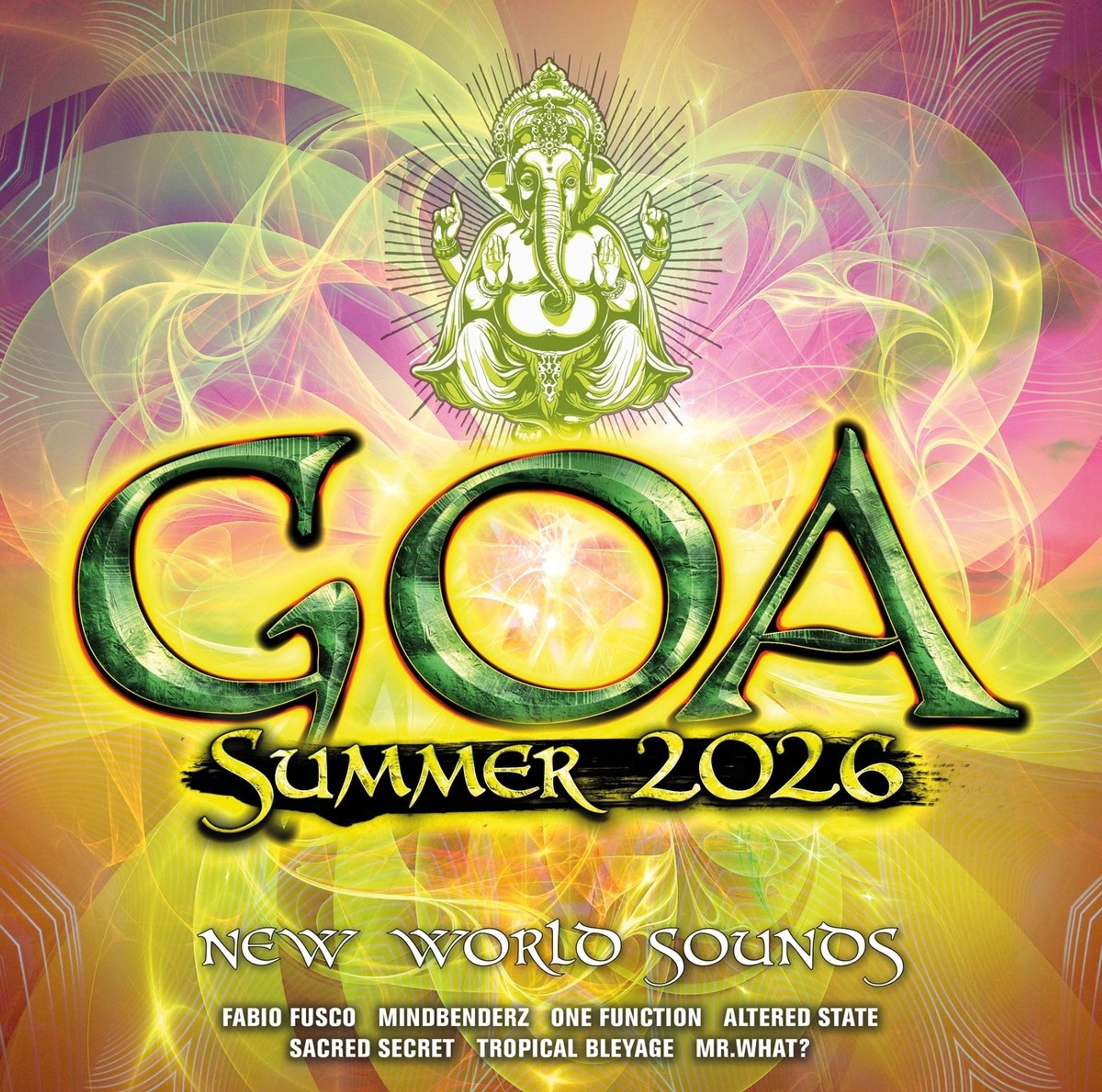 Text: "GOA Summer 2026, New World Sounds, Fabio Fusco, Mindbenderz, One Function, Altered State, Sacred Secret, Tropical Bleyage, Mr.What?"