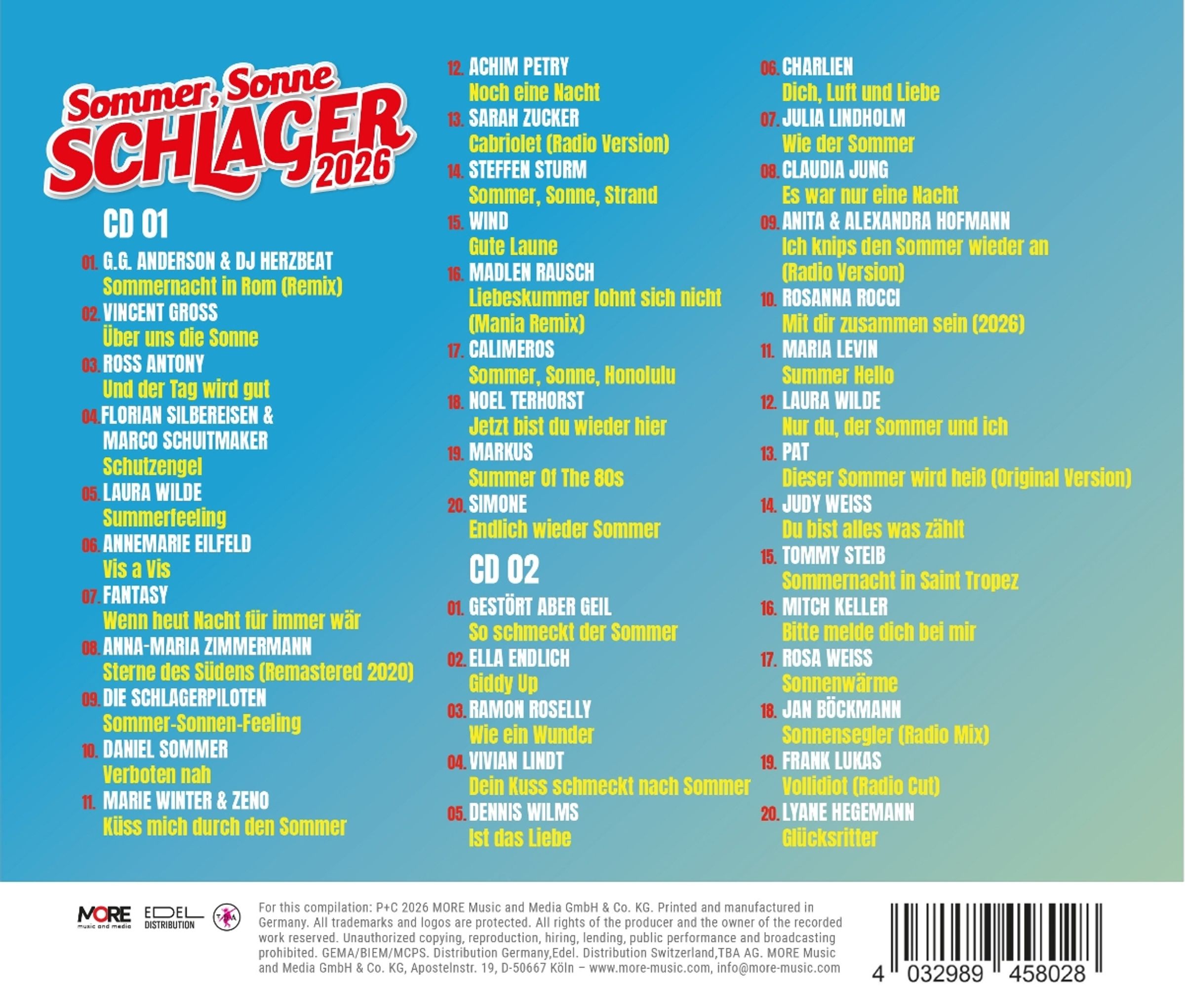 »Sommer, Sonne, Schlager 2026« – Die Schlager-Party des Jahres präsentiert die schönsten Schlager-Hits des Jahres auf 2CDs. 40 Hits, die liebevoll zusammengestellt wurden und von vorne bis hinten gute Laune verbreiten und jedem ein Lächeln ins Gesicht zaubern. »Sommer, Sonne, Schlager 2026« – Die Schlager-Party des Jahres ist perfekt für die private Party, für einen Ausflug ins Grüne oder einen gemütlichen Abend auf dem Balkon – einfach perfekt für jede Gelegenheit!