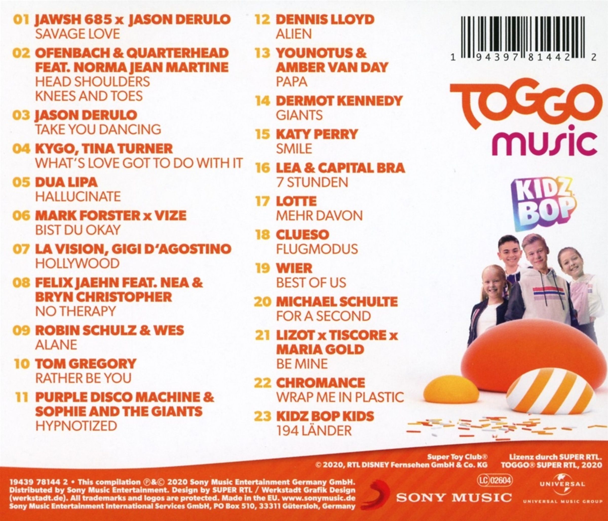 TOGGO Music, die Nummer 1 Hit-CD für alle Preteens zeigt mal wieder den "Großen" wo der Hammer hängt! Mit der SuperRTL-Show "Super Toyclub" als Präsentator und wieder voll bestückt mit den coolsten Stars der Kids.