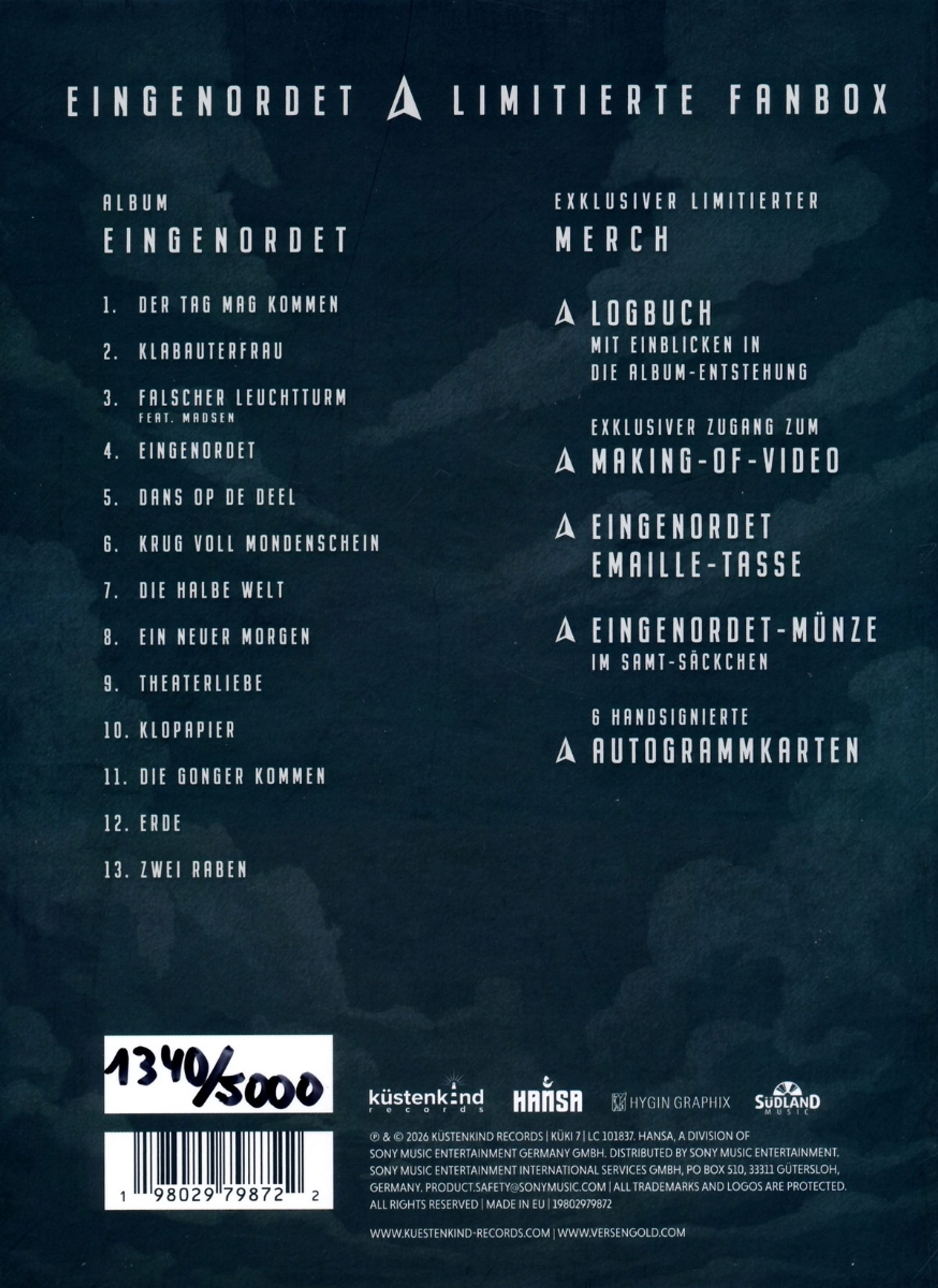 - Logbuch mit Einblicken in die Album-Entstehung - Exklusivem Zugang zum Making-Of-Video - Emaille-Tasse - Geprägter Sammlermünze - 6 handsignierten Autogrammkarten - Chance auf das Goldene Ticket für ein Wohnzimmerkonzert