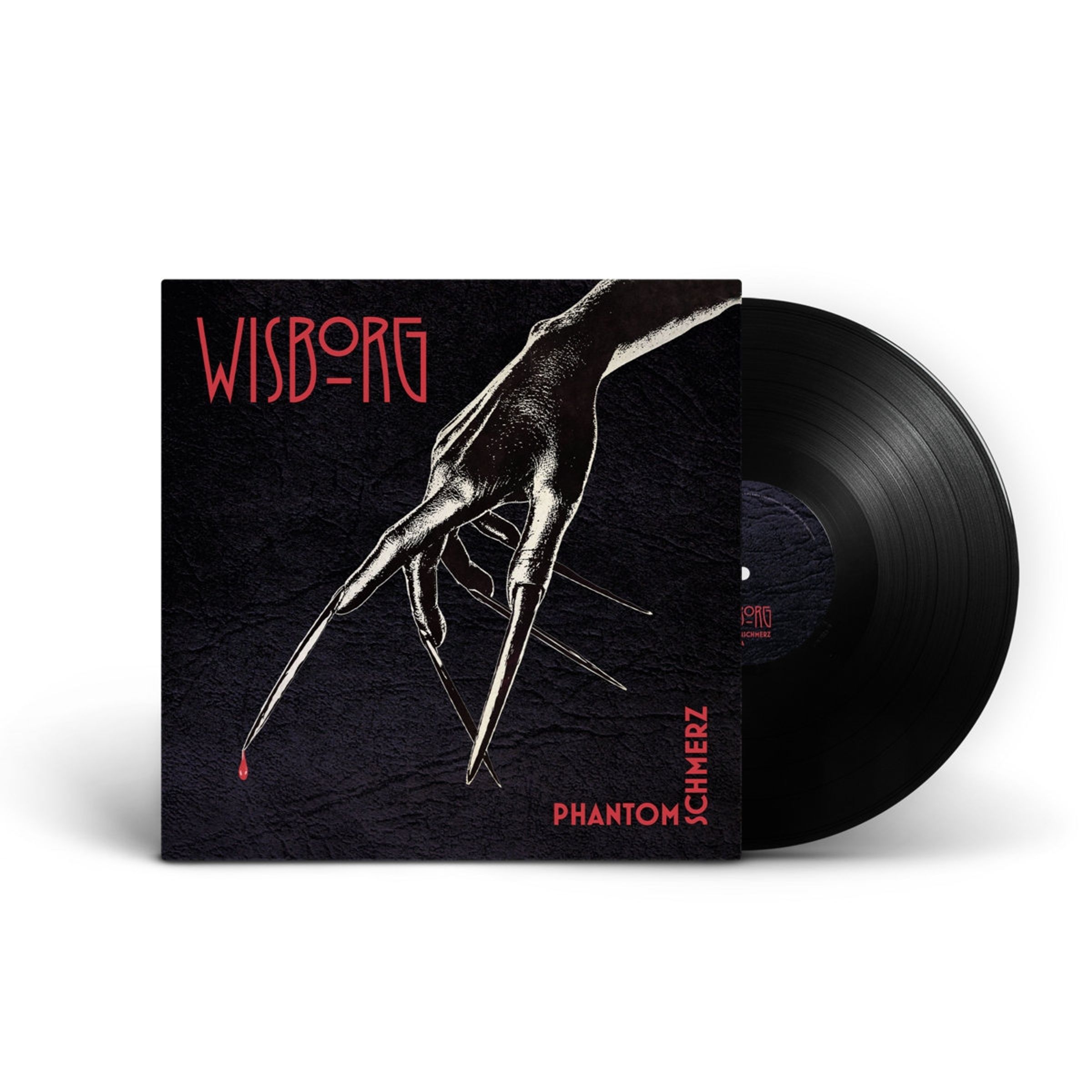 Cover der Schallplatte mit Text "WISBORG" und "Phantomschmerz", zeigt eine Hand mit langen spitzen Nägeln., LP