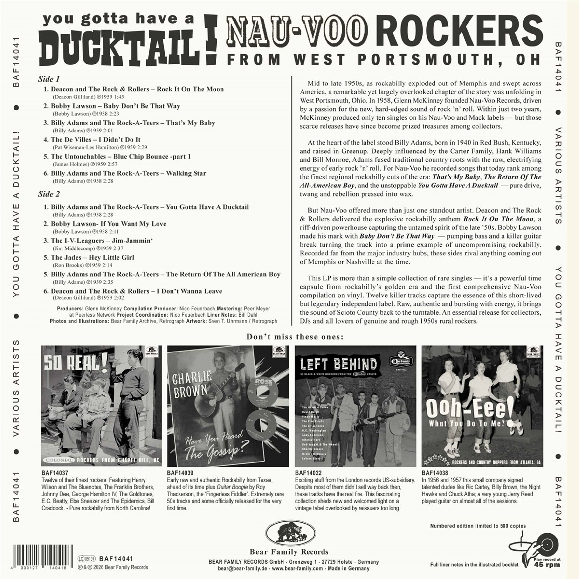 Mit »You Gotta Have A Ducktail! - Nau Voo Rockers From West Portsmouth, OH« präsentiert Bear Family Records® erstmals eine umfassende Nau-Voo-Compilation auf Vinyl. Zwölf kompromisslose Killertracks bündeln die Essenz dieses kurzlebigen, aber legendären Independent-Labels.