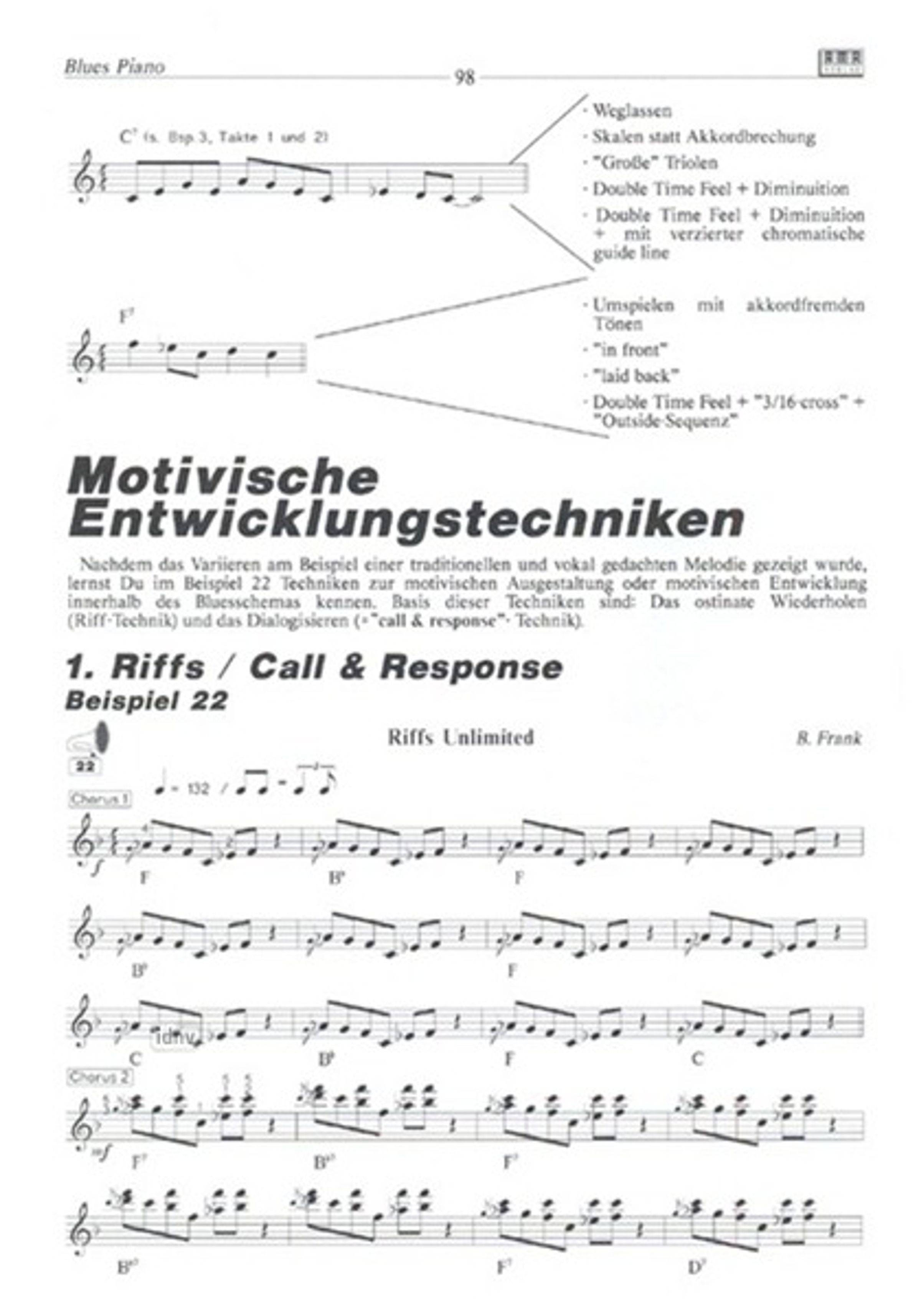 7. 7 Boogie Woogie / 1. Mehrstimmige Begleit­Patterns / 2. Beidhändige Begleit­Grooves / 3. Einstimmige Begleit­Patterns / 4. Rhythm & Blues­Grooves / Walking Bass / Harmonisierungstechniken / 1. Melodie mit Oberstimme / 2. Mehrstimmiges Aussetzen / rechte Hand / Locked Hand­Style / Stride Piano Style