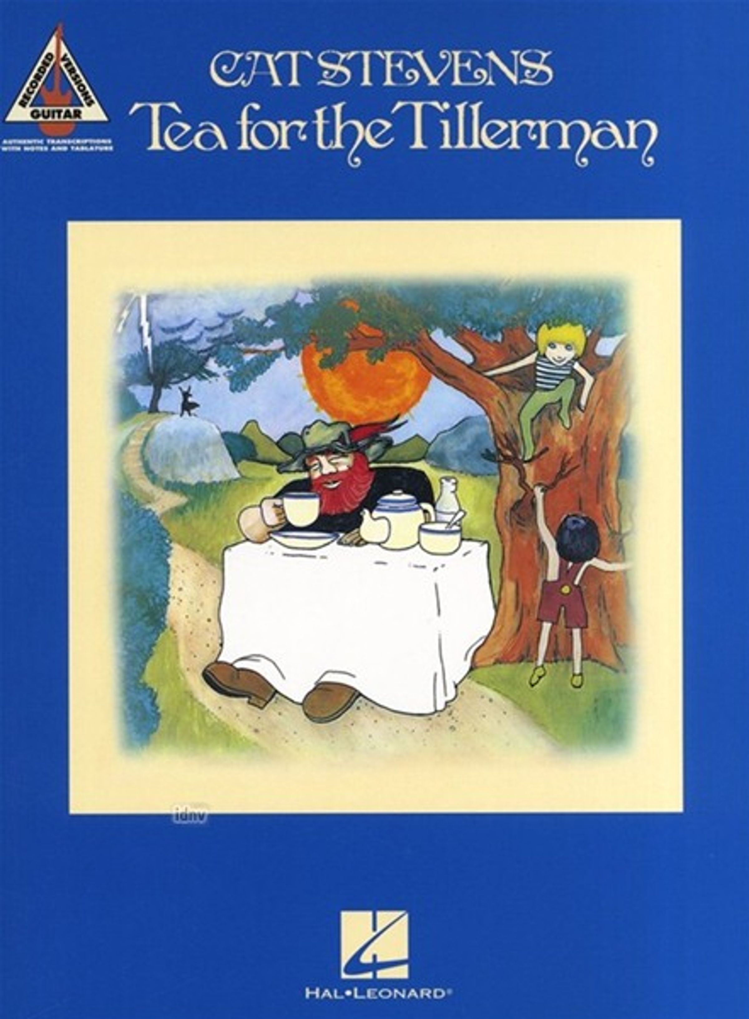 "CAT STEVENS, Tea for the Tillerman." Illustration: Ein Mann sitzt am Tisch, ein Kind schaut von einem Baum, große Sonne im Hintergrund., Noten