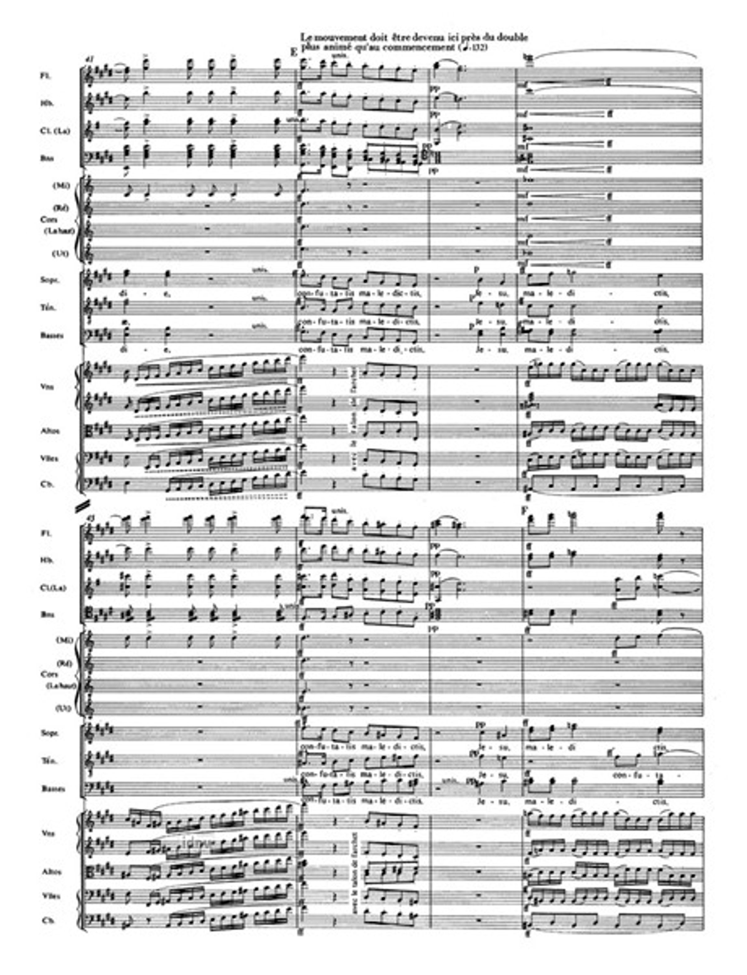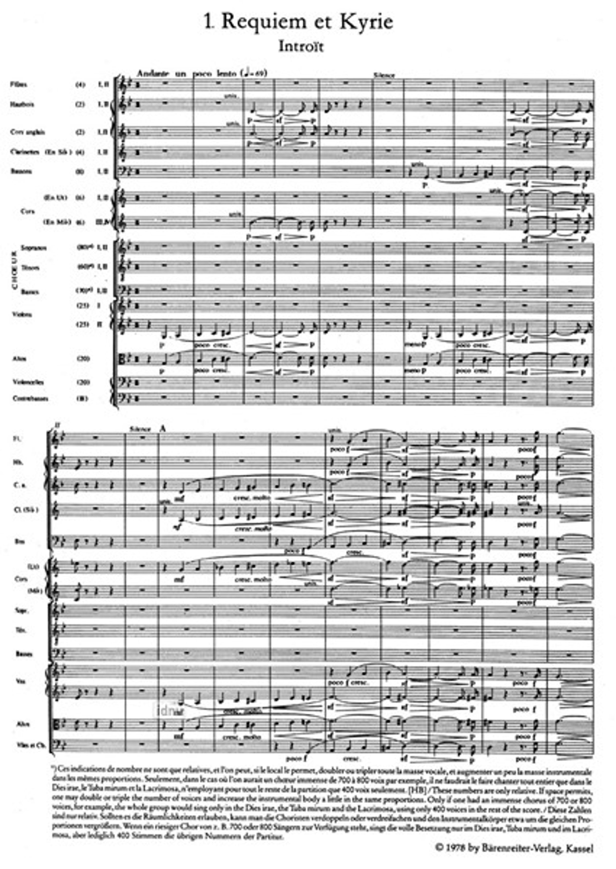 - Tenor solo, Gemischter Chor: SSTTBB, Flöten (4), Oboen (2), Englischhorn (2), Klarinetten (4), Fagotte (8), Hörner (12), Pauken (10), Schlagzeug, Streicher, 1.