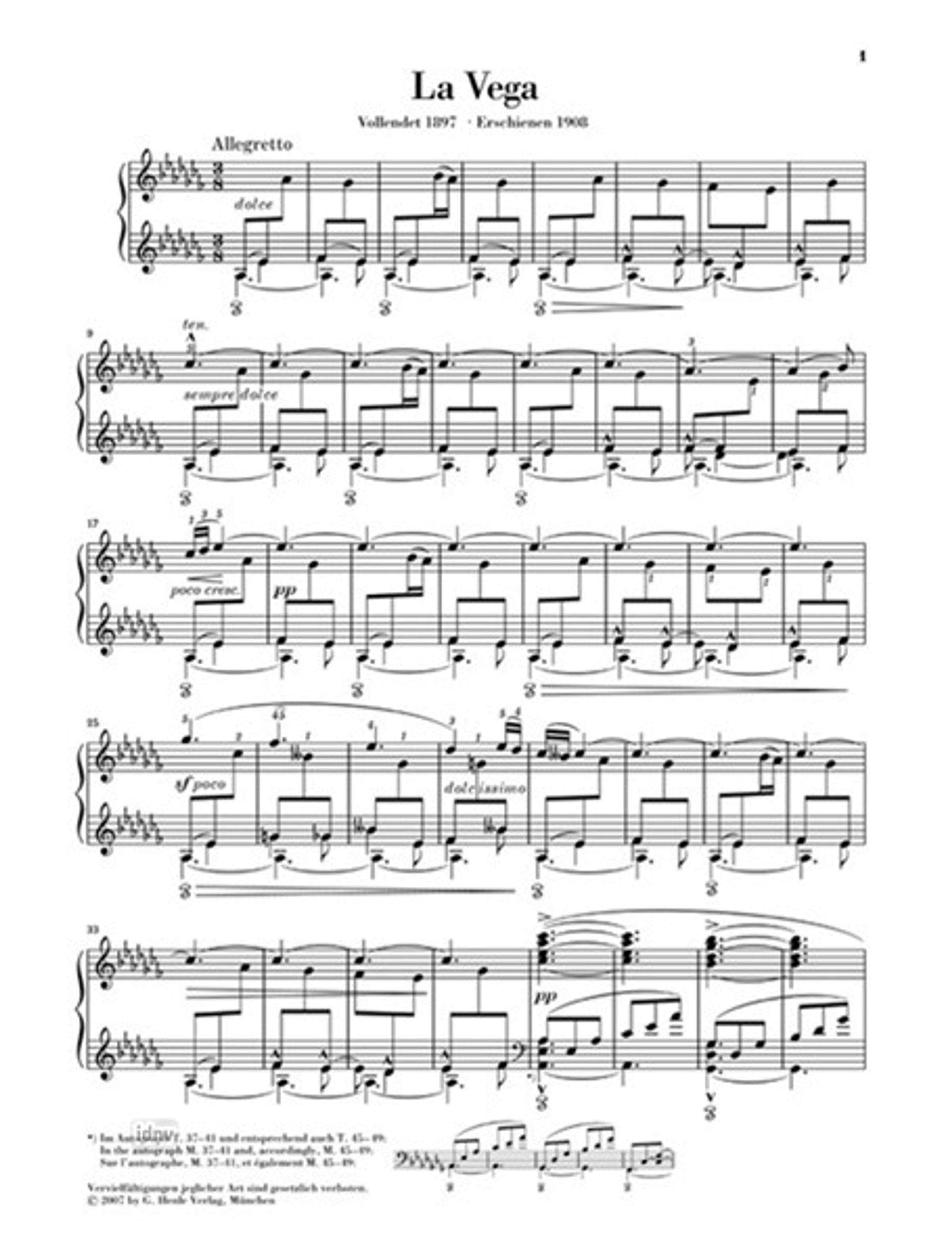 "La Vega" beschreibt den Blick über die Ebene von Granada, so wie sie sich vom arabischen Palast der Alhambra aus darstellt. Die reizvolle Landschaft inspirierte Albéniz zu einem zarten impressionistischen Klanggemälde fast meditativen Charakters. Claude Debussy war so begeistert, dass er diesen Ort am liebsten sofort besucht hätte. "La Vega" ist in zwei stark voneinander abweichenden Fassungen überliefert, die wir beide in unserer Urtextausgabe vollständig wiedergeben, so dass sich dem Spieler ein einzigartiger Einblick in Albéniz' Komponistenwerkstatt eröffnet.?Anmerkungen: