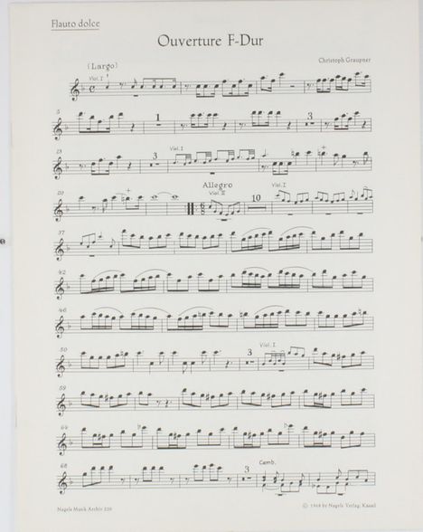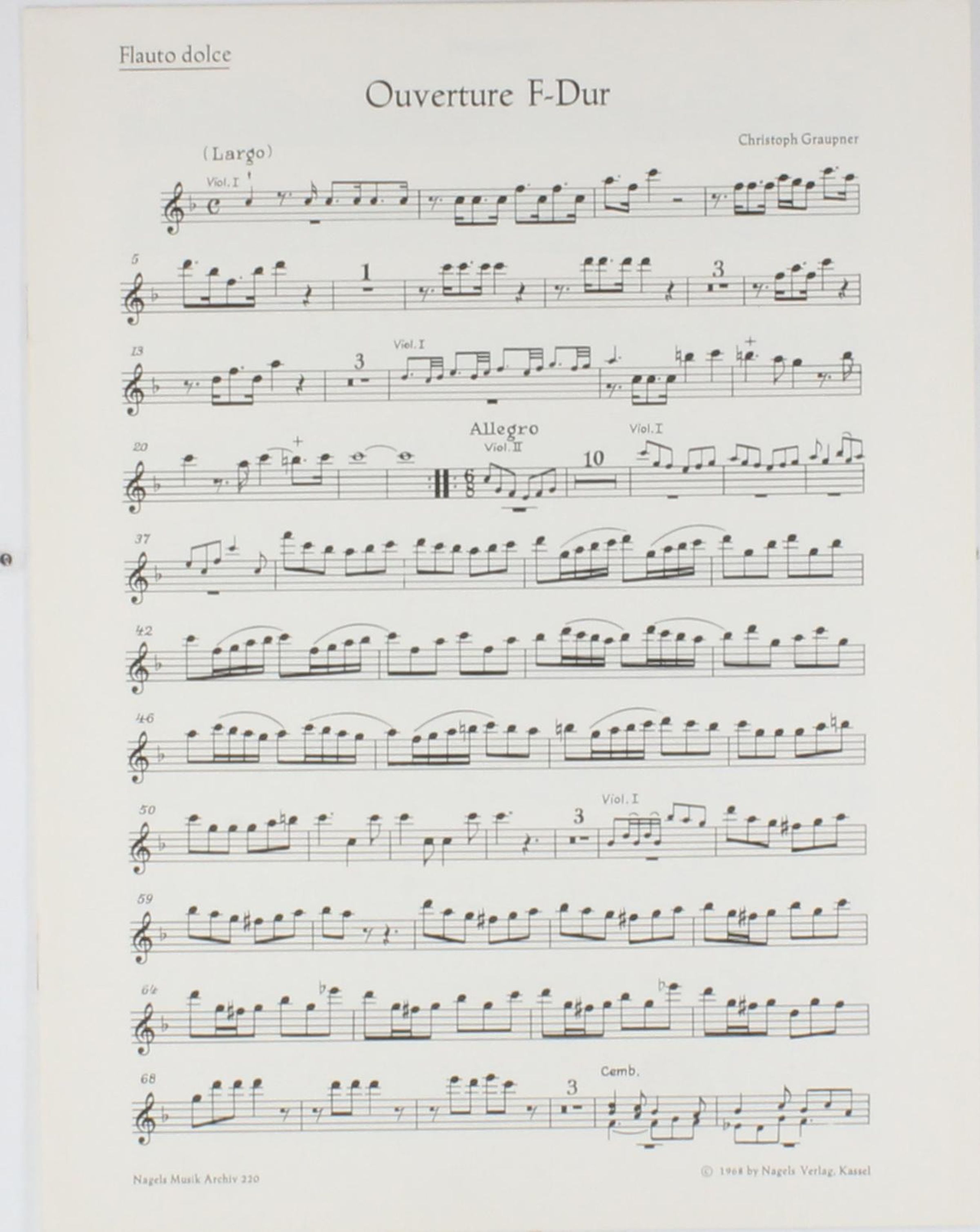 Christoph Graupner: Ouvertüre für Altblockflöte, Streicher und Basso continuo F-Dur