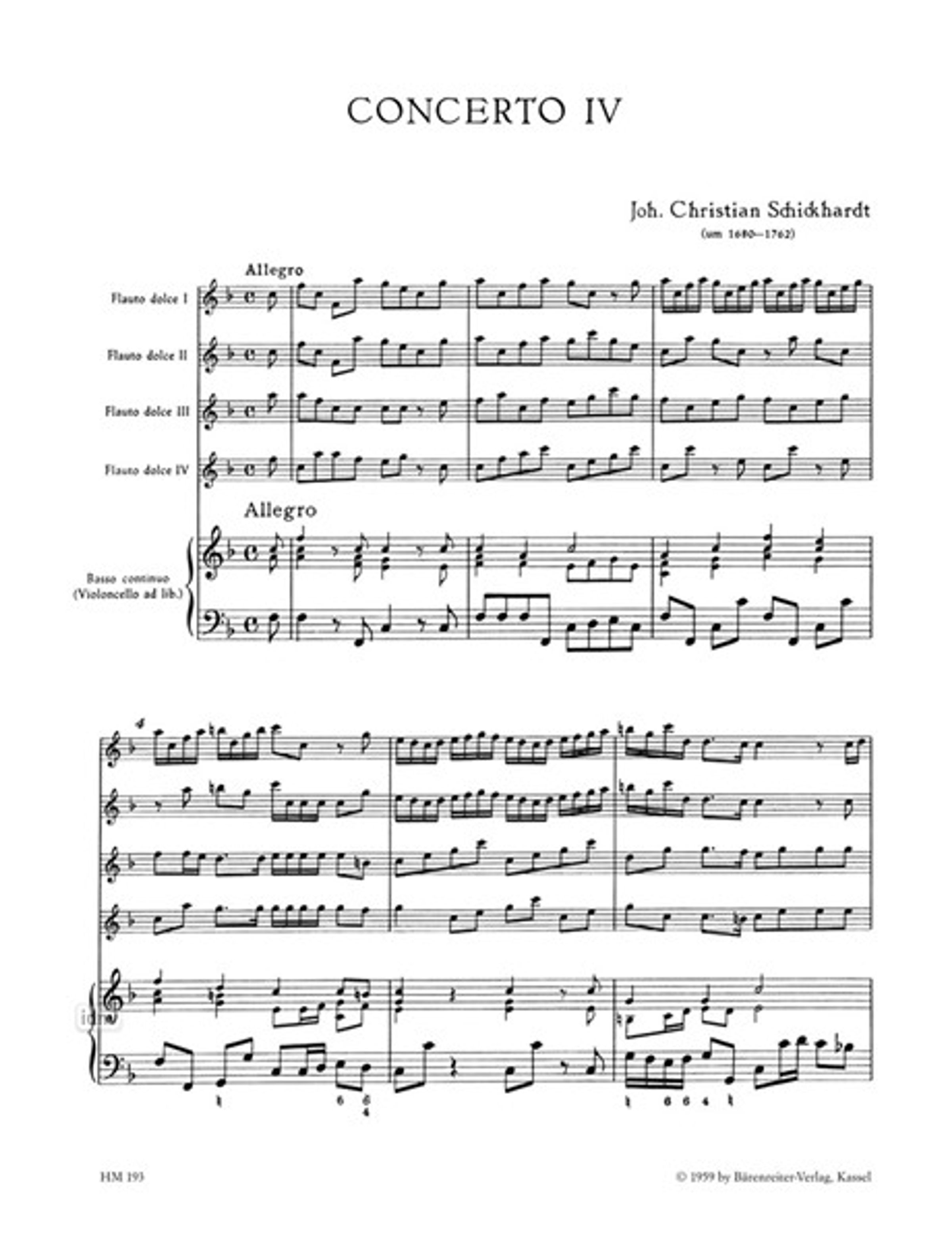 Johann Christian Schickhardt: Konzerte für vier Altblockflöten und Basso continuo