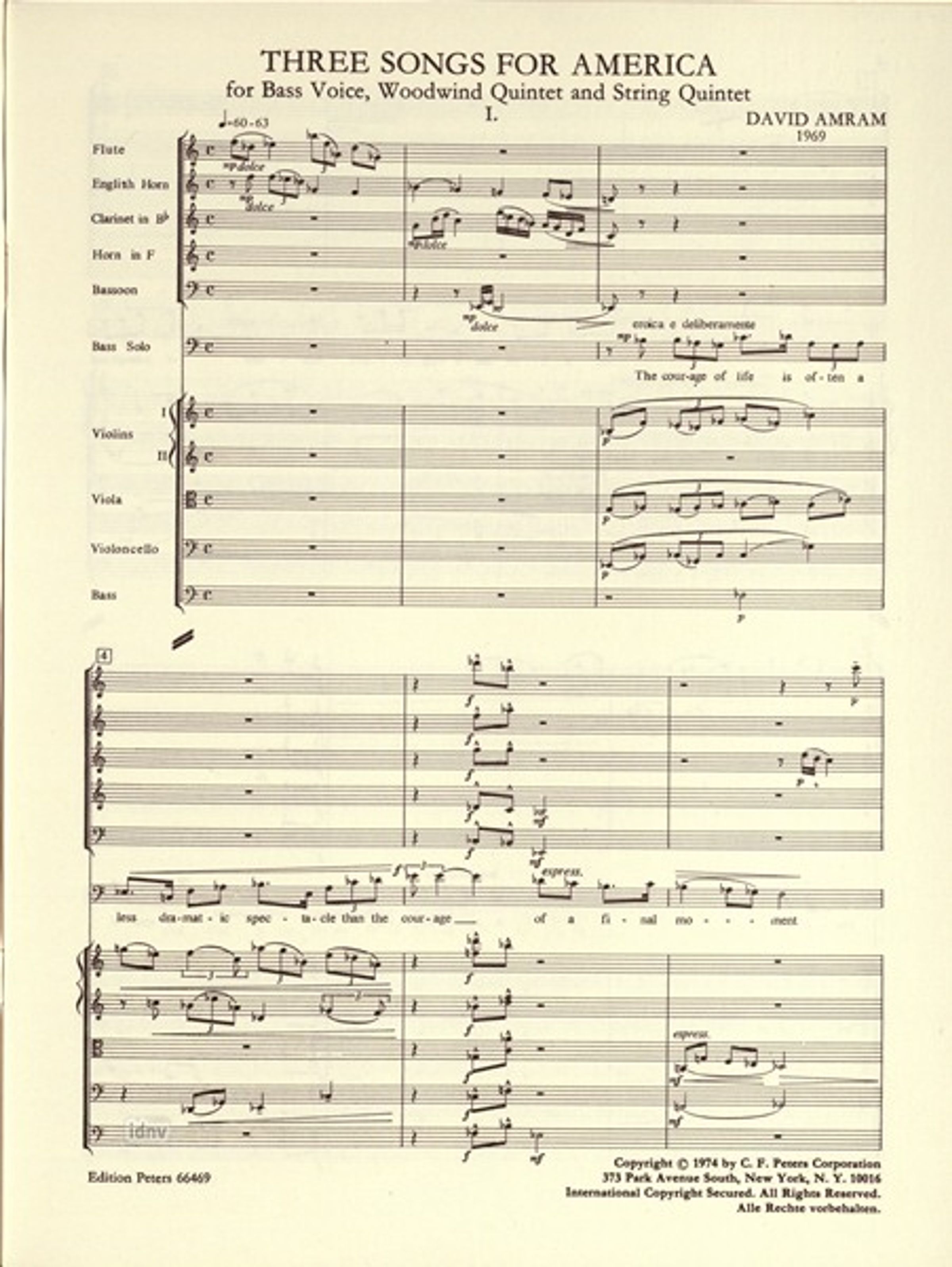David Amram: Three Songs for America für Bass, Holzbläserquintett und Streichquintett (1969)